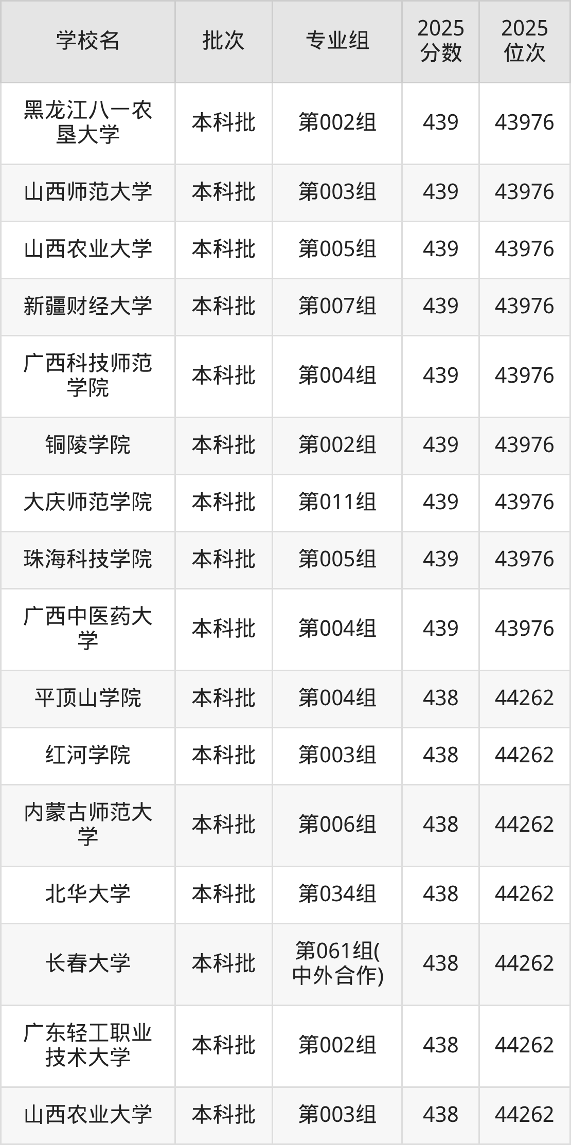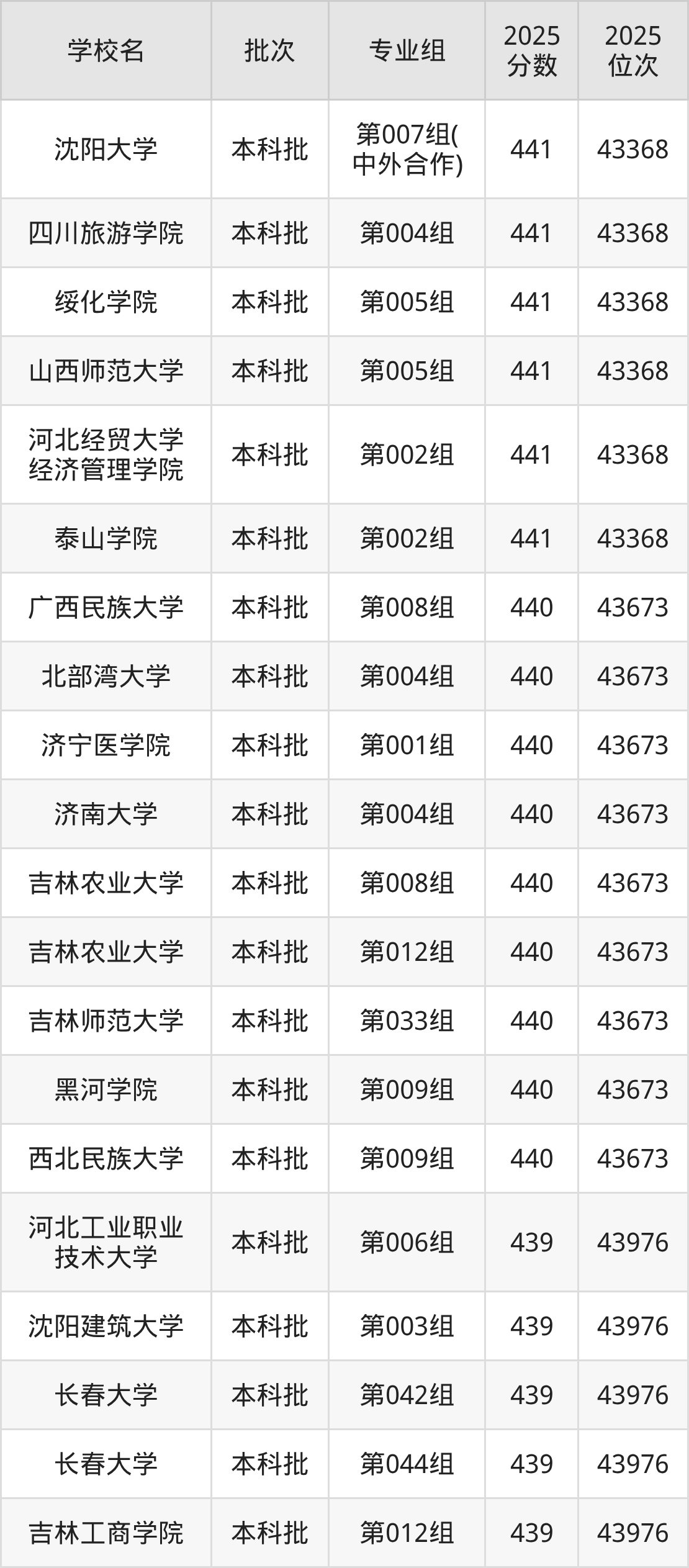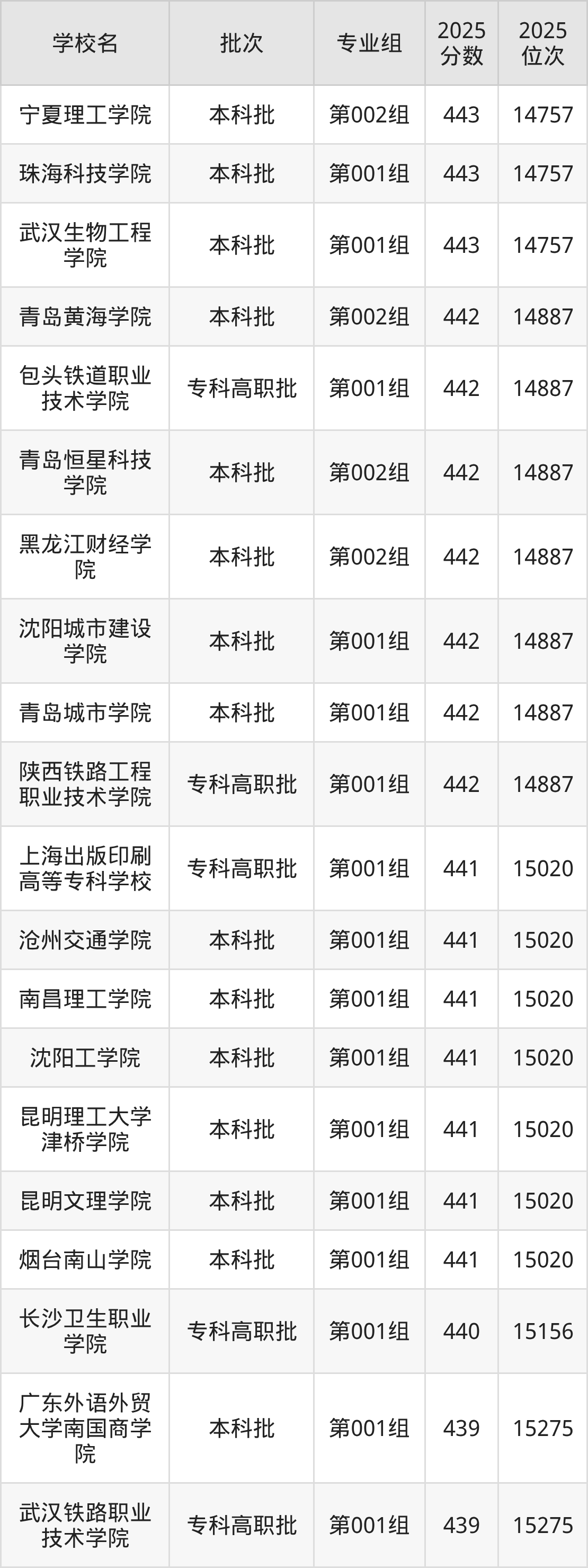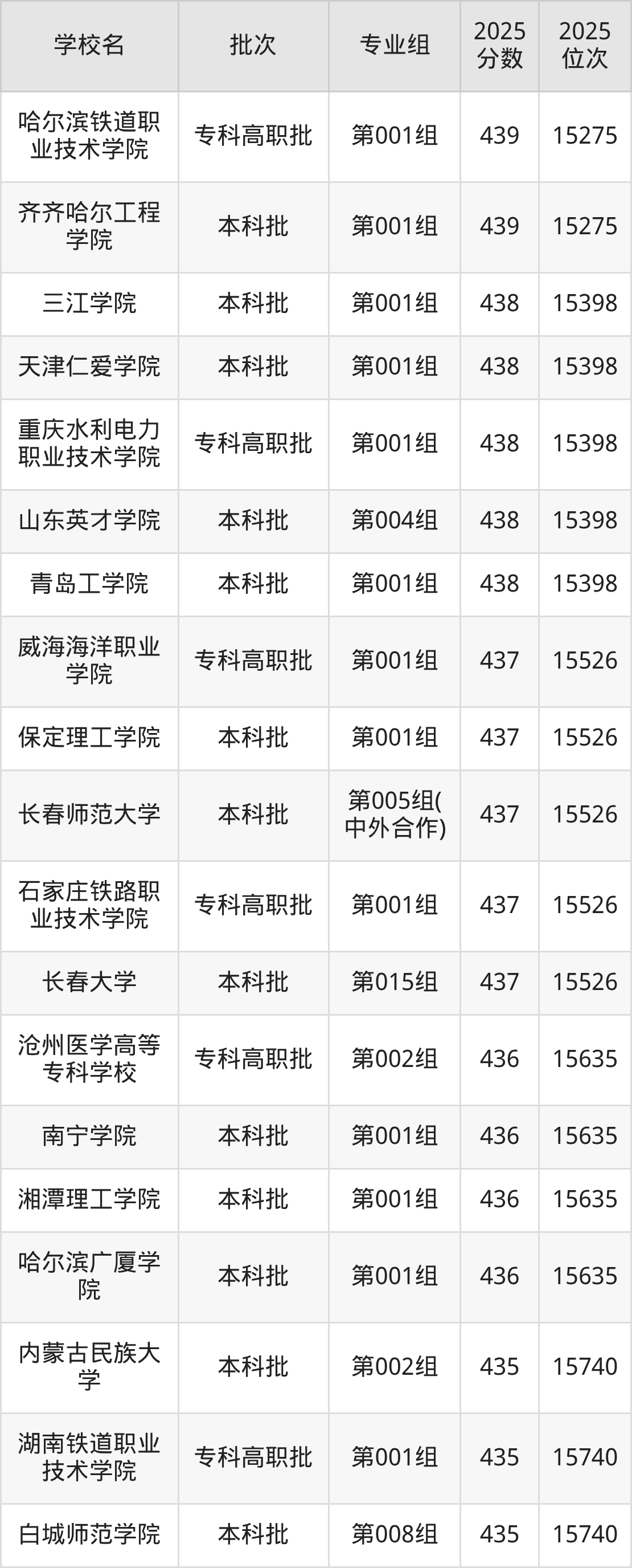 2025年吉林高考历史类439分(15157名~15275名)能上的大学有齐齐哈尔工程学院第001组、广东外语外贸大学南国商学院第001组、哈尔滨铁道职业技术学院第001组、武汉铁路职业技术学院第001组。