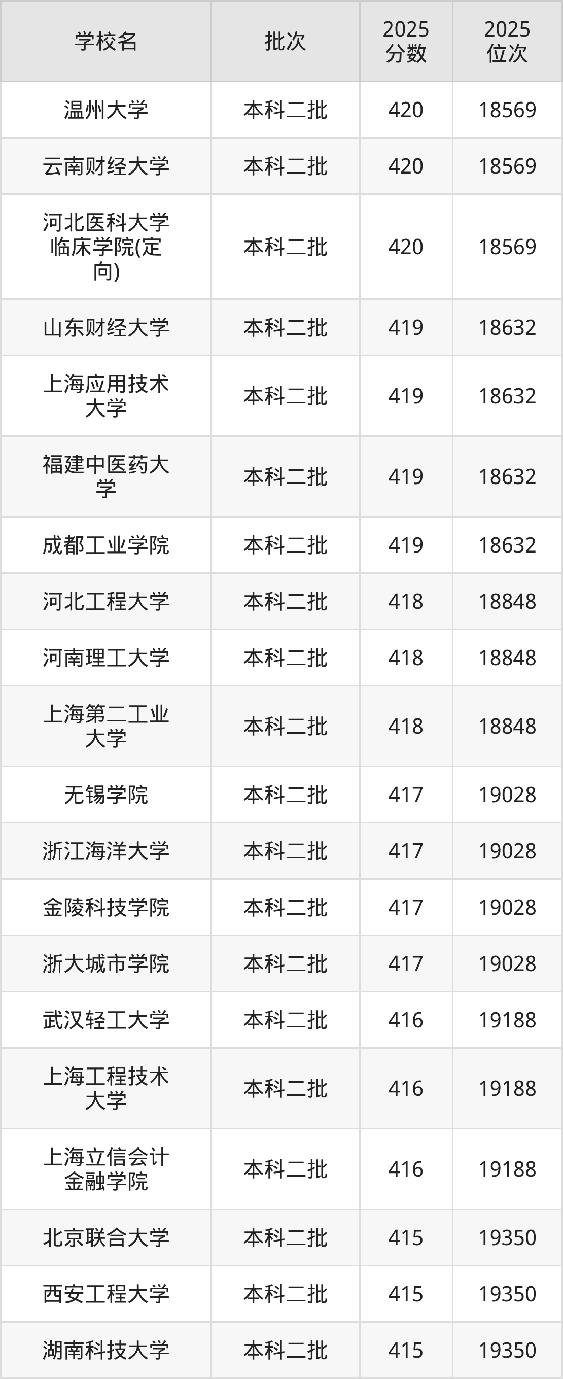 这些都是2026年高考理科19029名~19188名考生可以报考的大学,更多学校名单如下表所示: