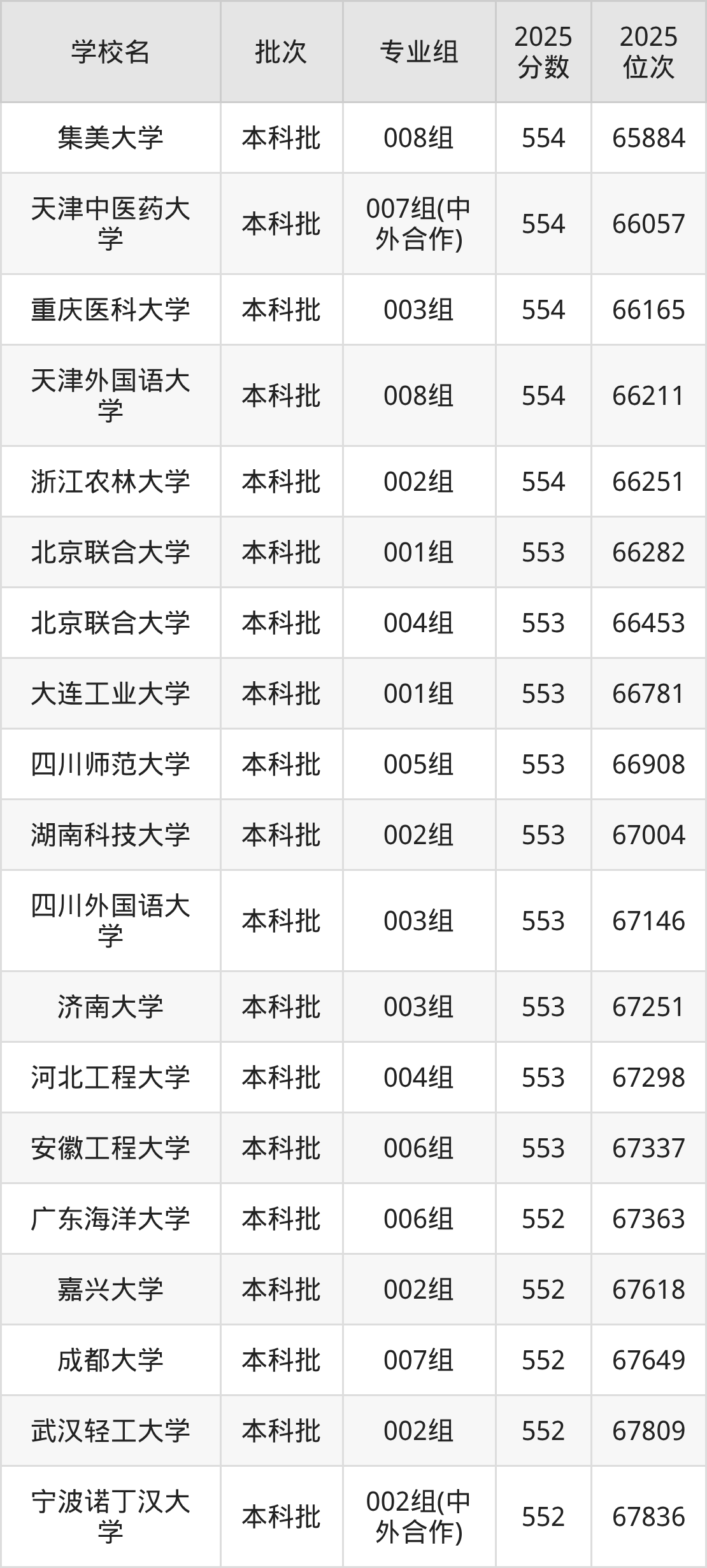 另外录取位次低于该区间(较稳妥)的有广东海洋大学006组(67363名)、嘉兴大学002组(67618名)等;录取位次高于该区间(可冲)的有浙江农林大学002组(66251名)、天津外国语大学008组(66211名)等。