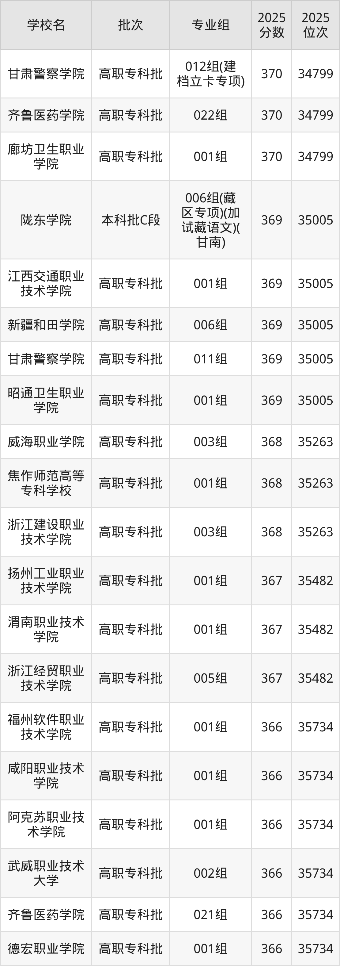 2025年甘肃高考历史类367分(35264名~35482名)能上的大学有扬州工业职业技术学院001组、浙江经贸职业技术学院005组、渭南职业技术学院001组。
