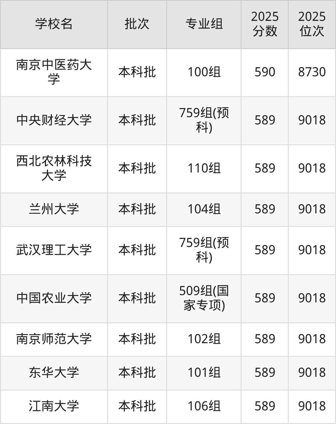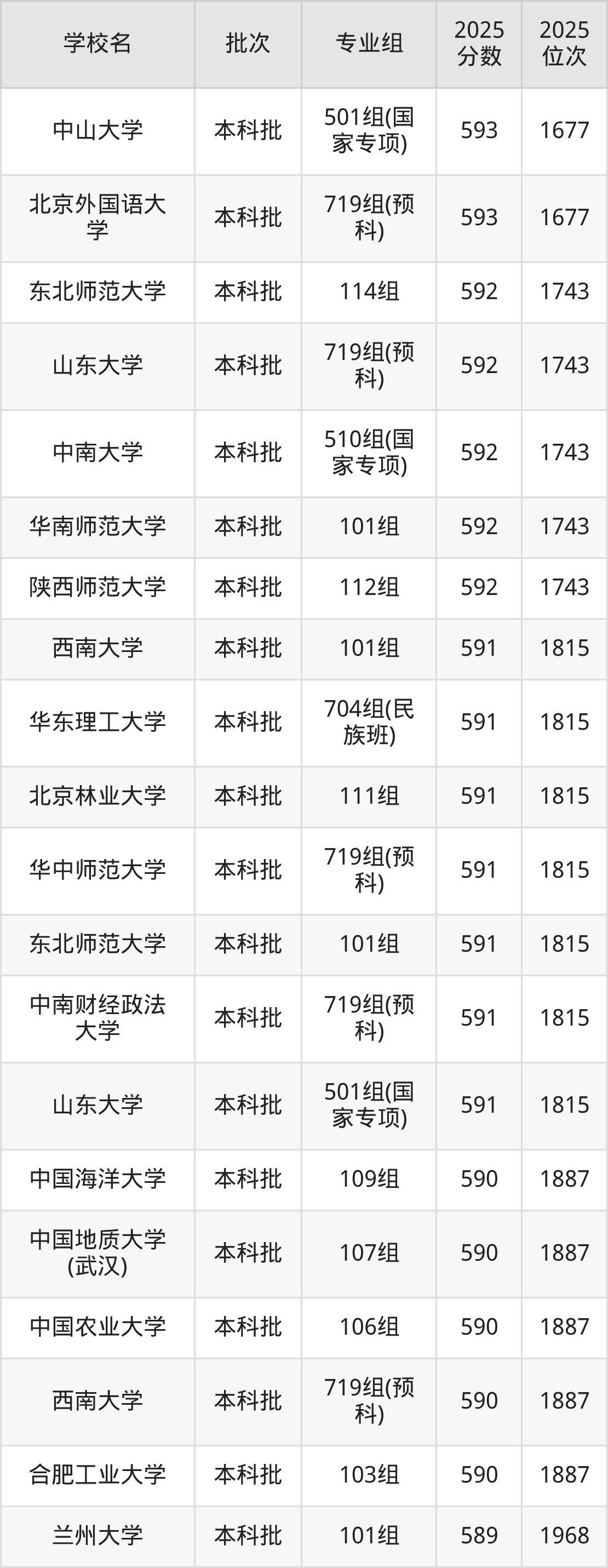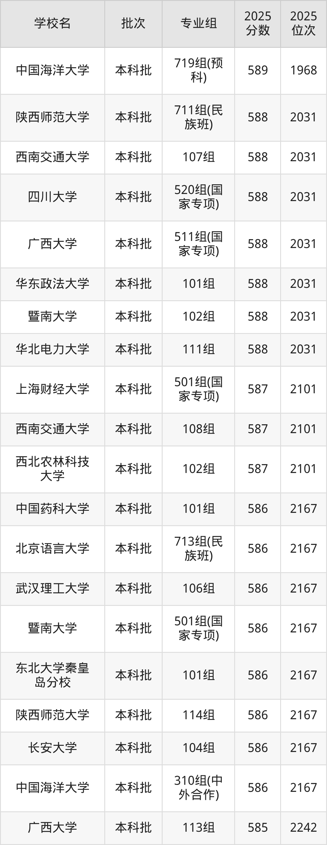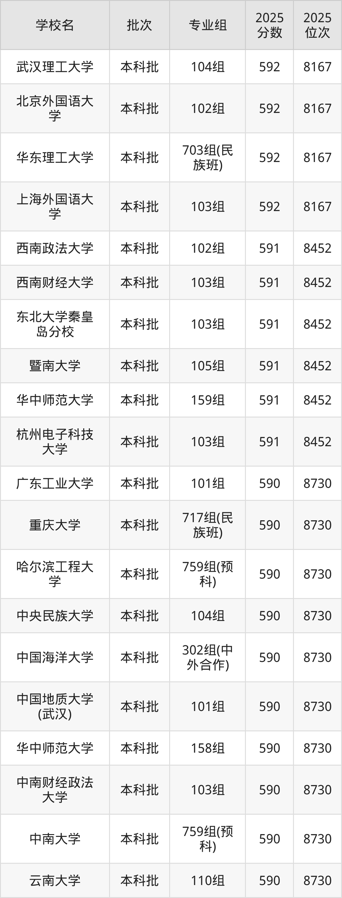 2025年广西高考物理类590分(8453名~8730名)能上的大学有中央民族大学104组、哈尔滨工程大学759组(预科)、南京中医药大学100组、中国海洋大学302组(中外合作)等。