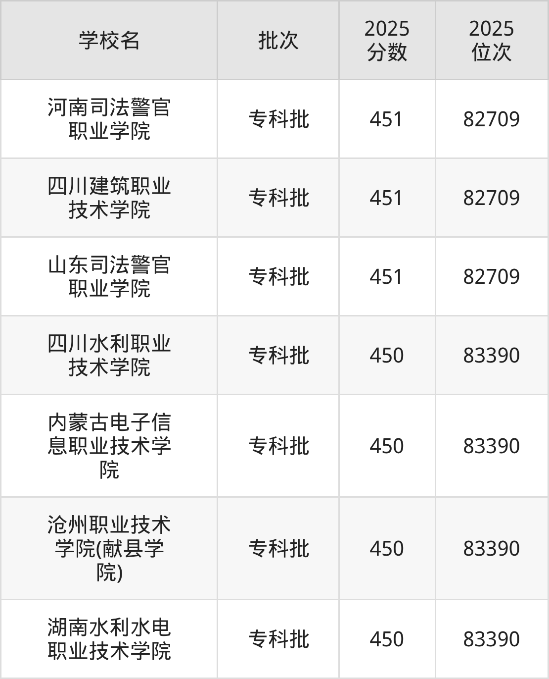 2025年河北高考历史类450分(82710名~83390名)能上的大学有四川水利职业技术学院、湖南水利水电职业技术学院、沧州职业技术学院(献县学院)、内蒙古电子信息职业技术学院。
