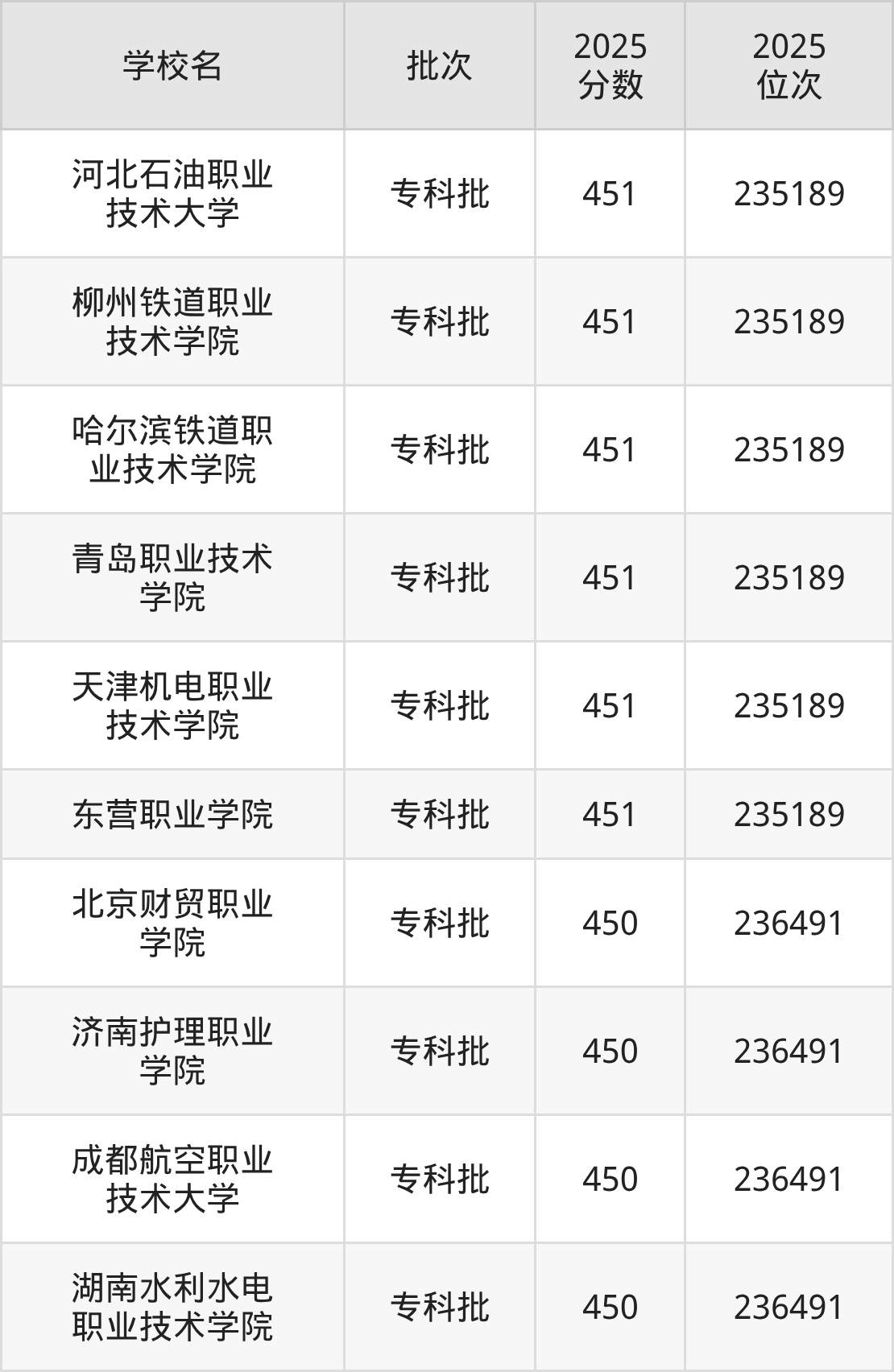 2025年河北高考物理类450分(235190名~236491名)能上的大学有湖南水利水电职业技术学院、北京财贸职业学院、济南护理职业学院、成都航空职业技术大学。