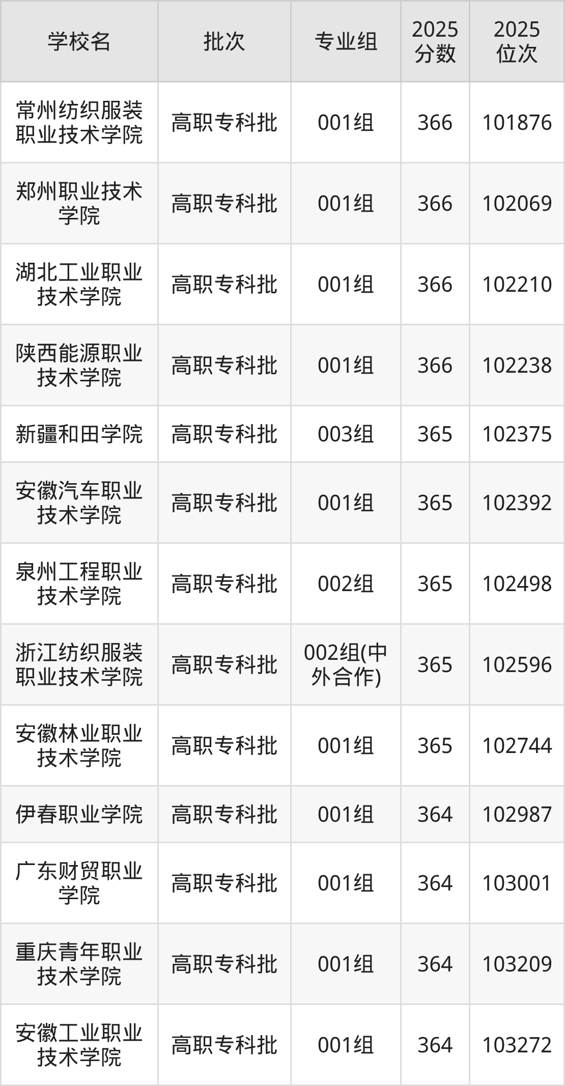 2025年安徽高考历史类365分(102308名~102795名)能上的大学有泉州工程职业技术学院002组、新疆和田学院003组、浙江纺织服装职业技术学院002组(中外合作)、安徽林业职业技术学院001组等。
