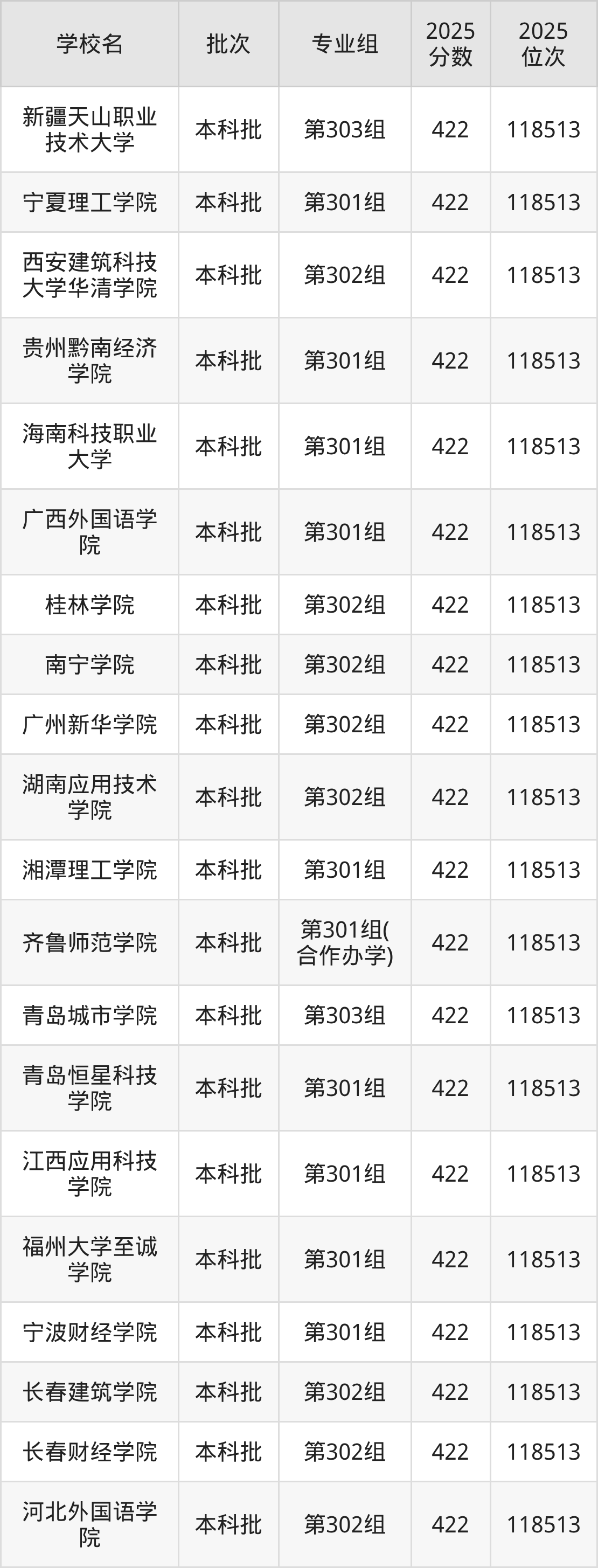 另外录取位次低于该区间(较稳妥)的有临汾职业技术学院第302组(高本贯通)(9283名)、武汉铁路职业技术学院第302组(9283名)等;录取位次高于该区间(可冲)的有青岛恒星科技学院第301组(118513名)、河北外国语学院第302组(118513名)等。