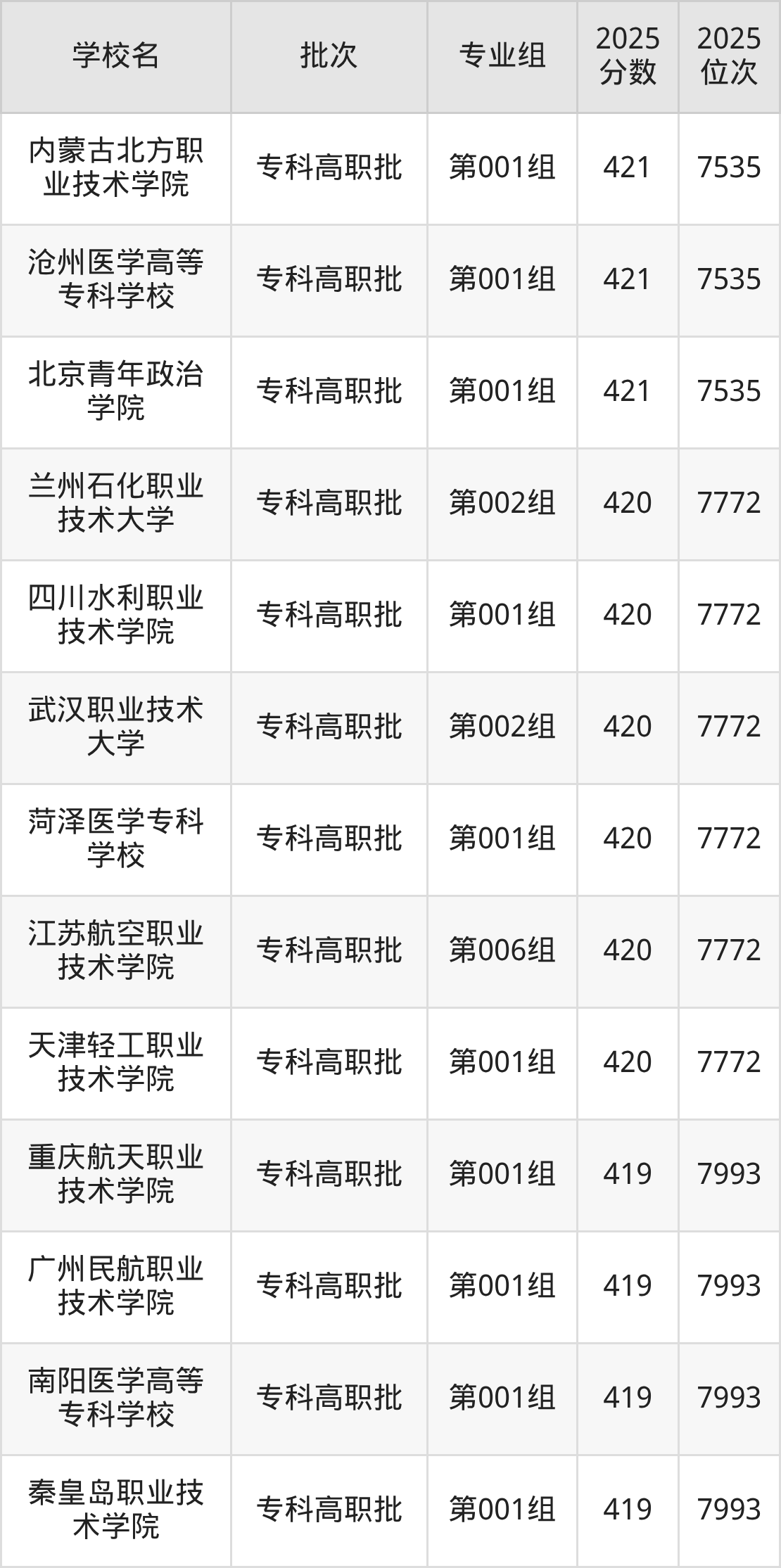 2025年山西高考历史类421分(7338名~7535名)能上的大学有北京青年政治学院第001组、沧州医学高等专科学校第001组、内蒙古北方职业技术学院第001组、徐州工业职业技术学院第001组等。