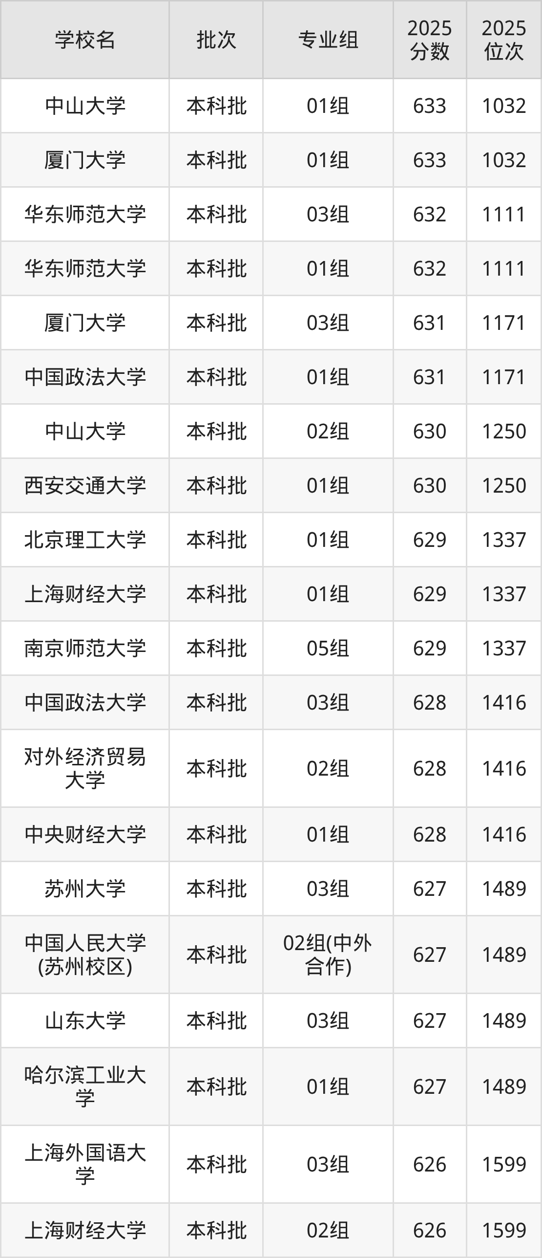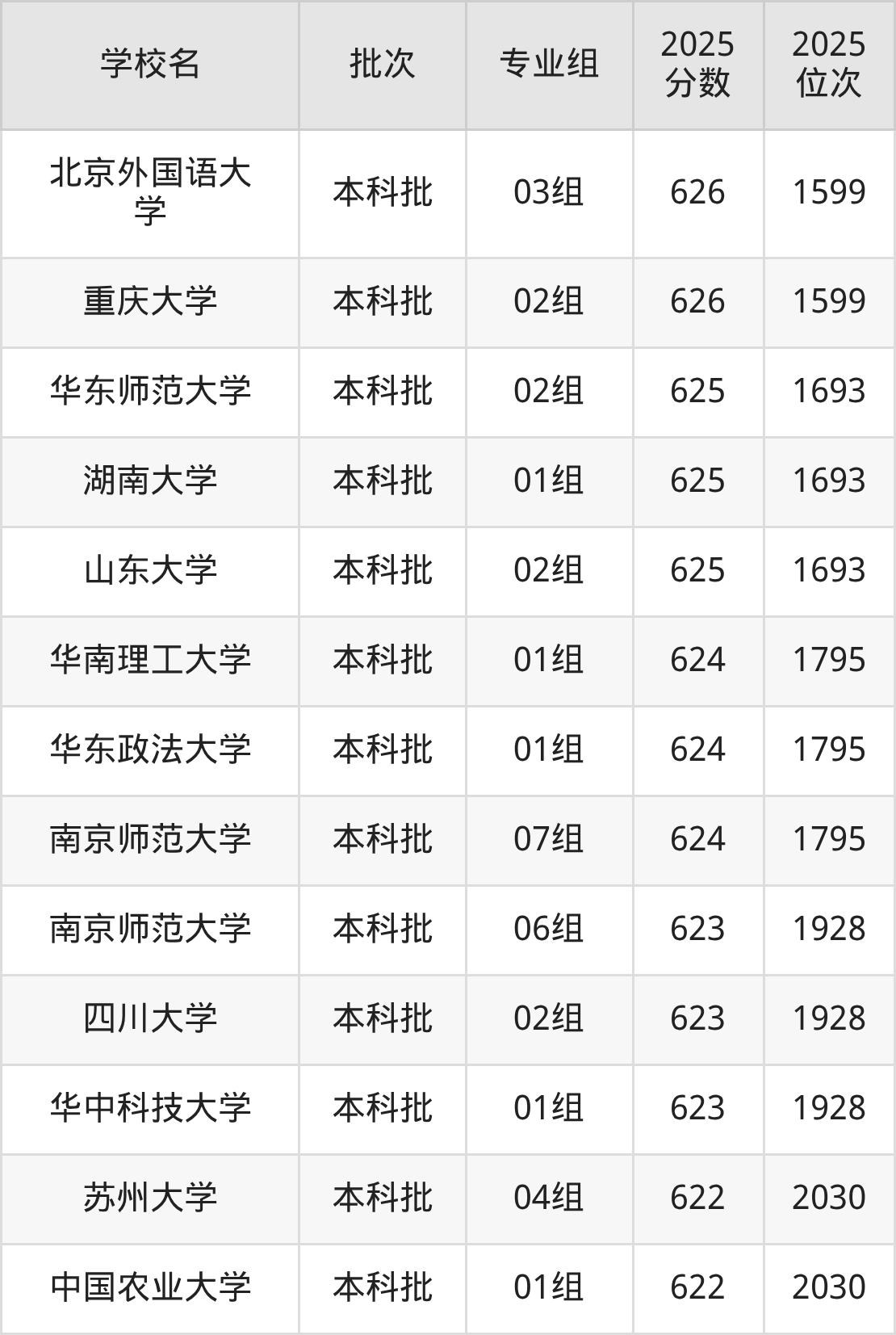 2025年江苏高考历史类626分(1490名~1599名)能上的大学有上海外国语大学03组、上海财经大学02组、北京外国语大学03组、重庆大学02组。