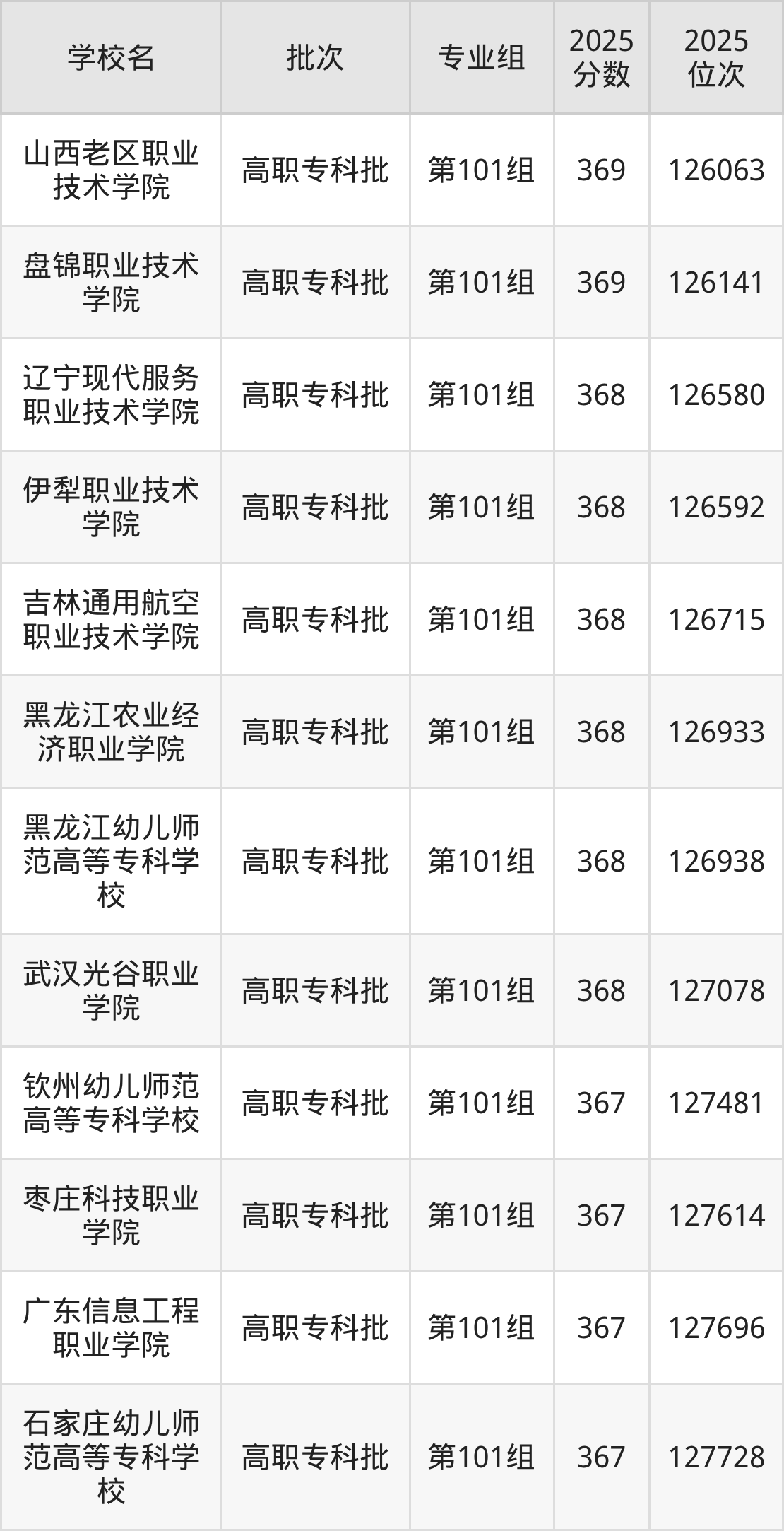 2025年江西高考历史类368分(126553名~127300名)能上的大学有黑龙江幼儿师范高等专科学校第101组、吉林通用航空职业技术学院第101组、黑龙江农业经济职业学院第101组、武汉光谷职业学院第101组等。