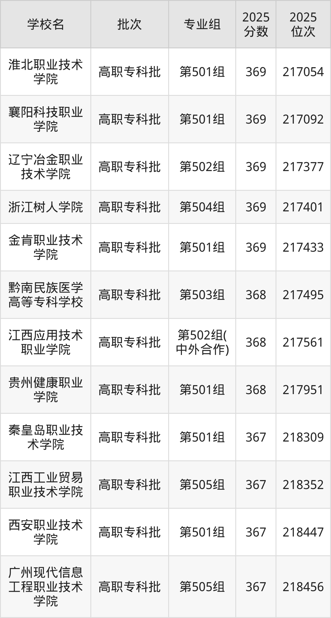 2025年江西高考物理类368分(217453名~218021名)能上的大学有黔南民族医学高等专科学校第503组、贵州健康职业学院第501组、江西应用技术职业学院第502组(中外合作)。