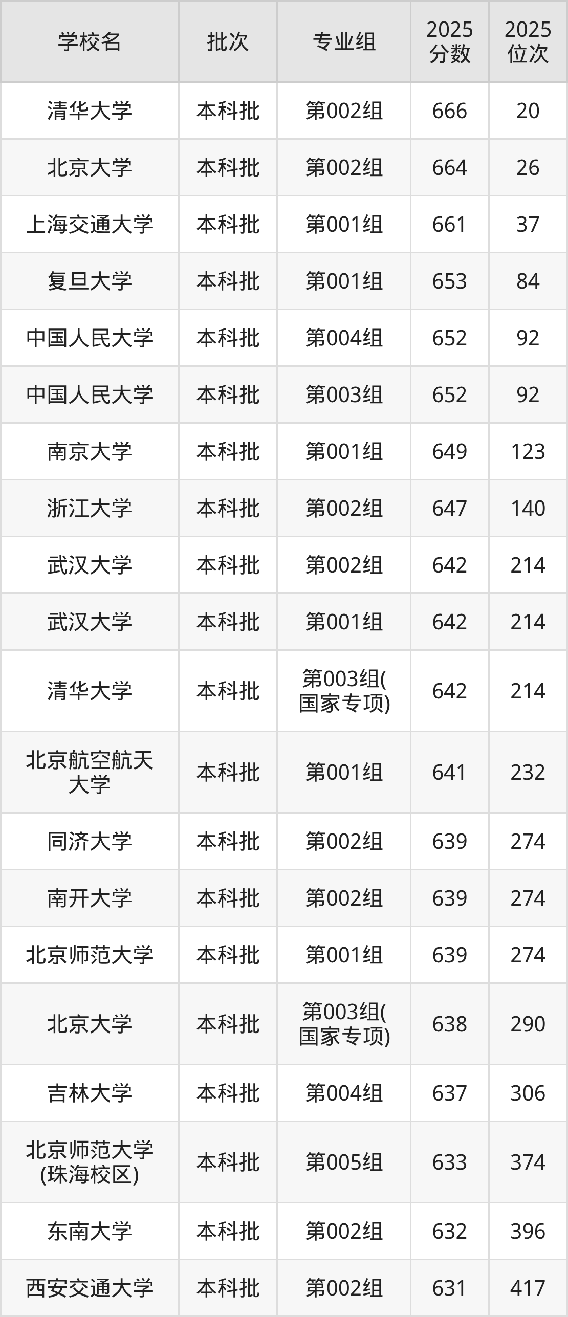 山西高考631分:历史类排名417位、物理类排名3837位。该分数位次对应能上的大学历史类有中国人民大学第005组(国家专项)、华东师范大学第005组;物理类有北京理工大学第303组(国家专项)、吉林大学第307组,更多名单如下文所示,2026届考生可参考。