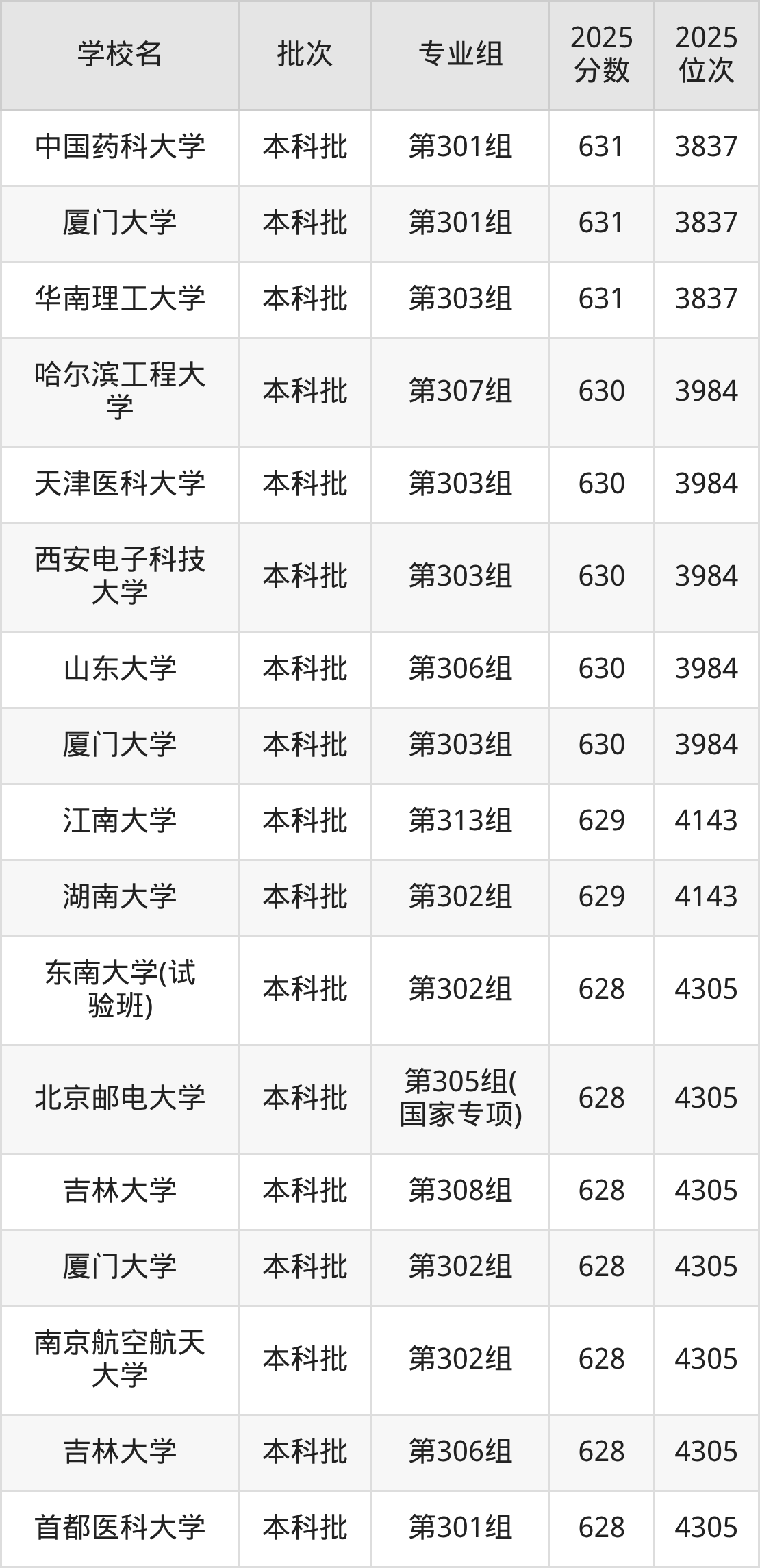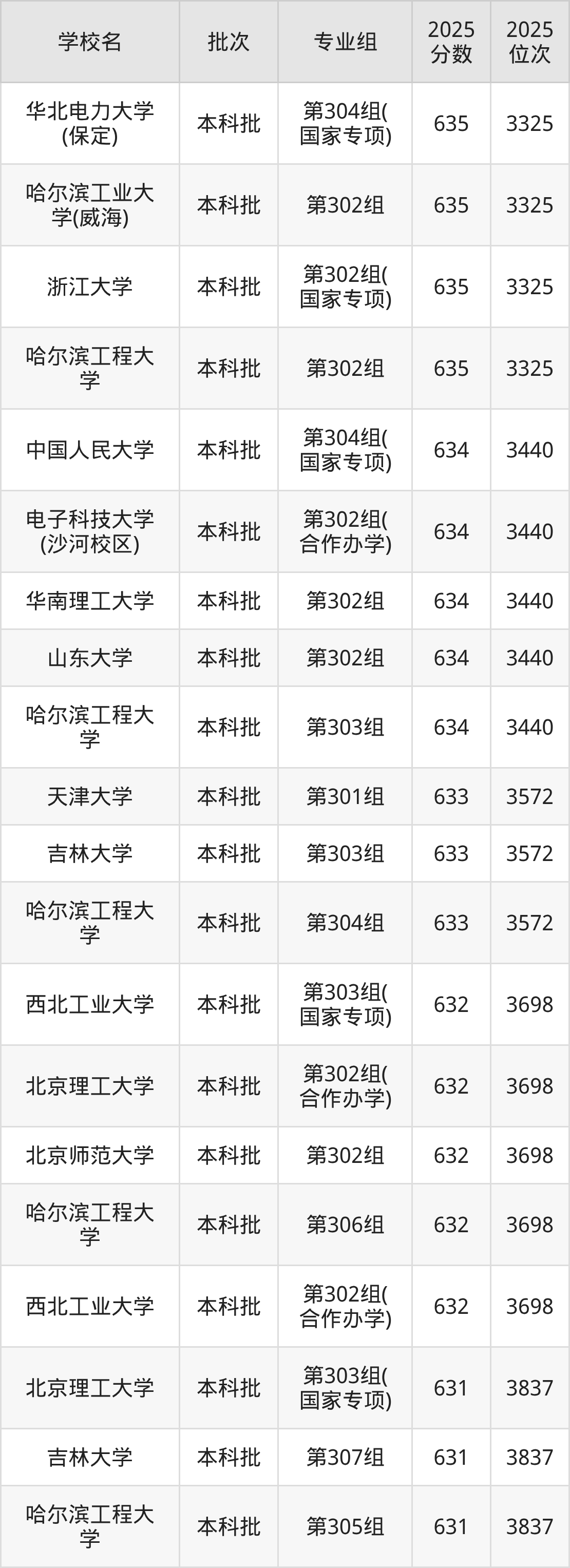 2025年山西高考物理类631分(3699名~3837名)能上的大学有北京理工大学第303组(国家专项)、吉林大学第307组、哈尔滨工程大学第305组、中国药科大学第301组等。