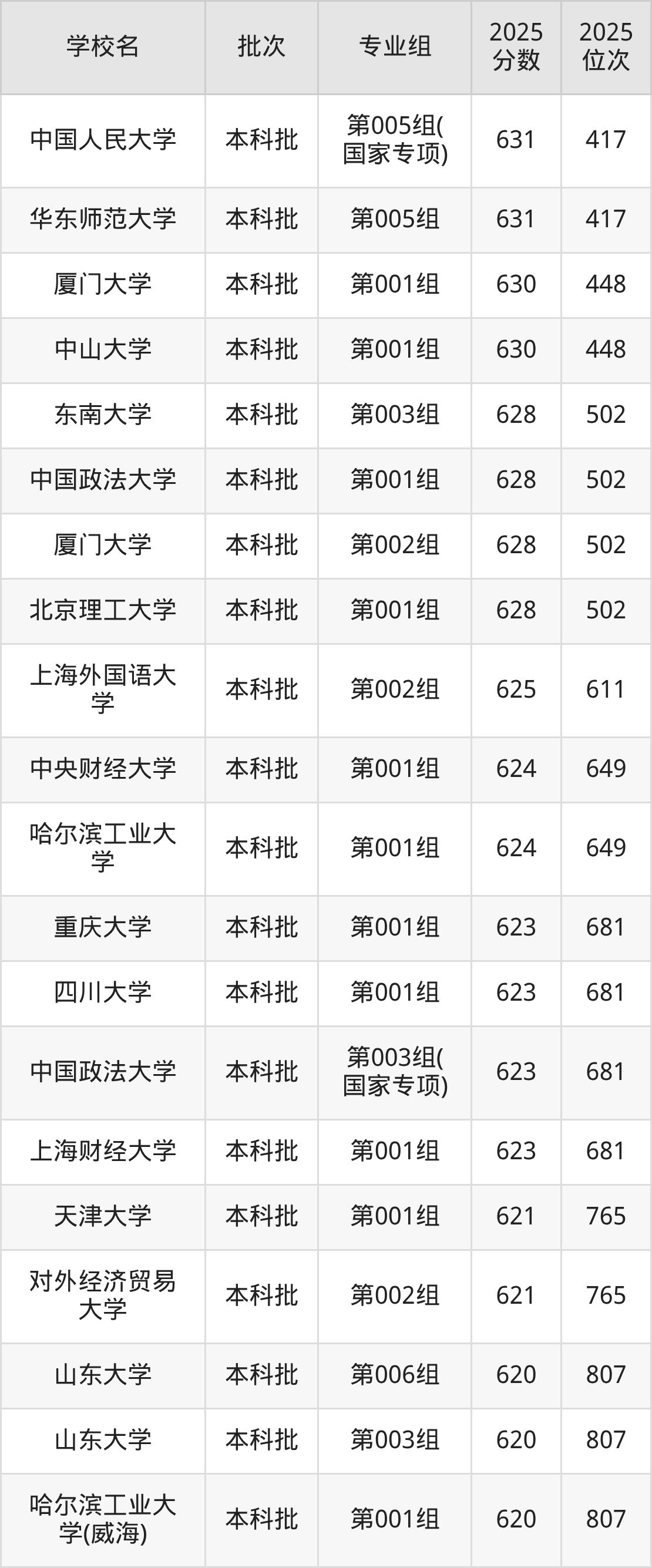2025年山西高考历史类631分(397名~417名)能上的大学有中国人民大学第005组(国家专项)、华东师范大学第005组、西安交通大学第002组。