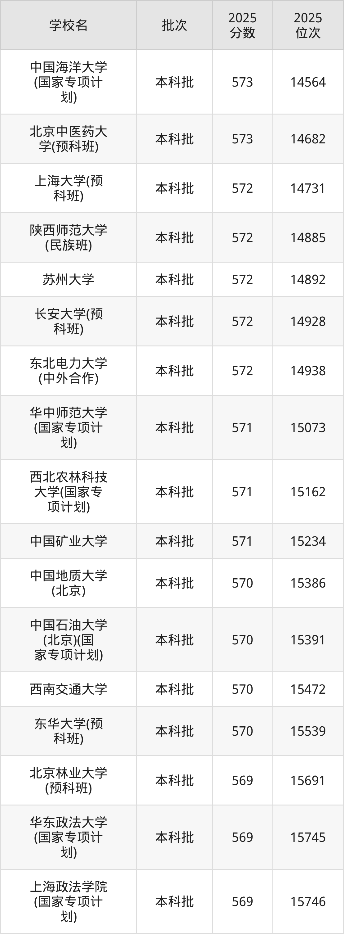 2025年贵州高考物理类571分(15030名~15352名)能上的大学有中国矿业大学、西北农林科技大学(国家专项计划)、华中师范大学(国家专项计划)。