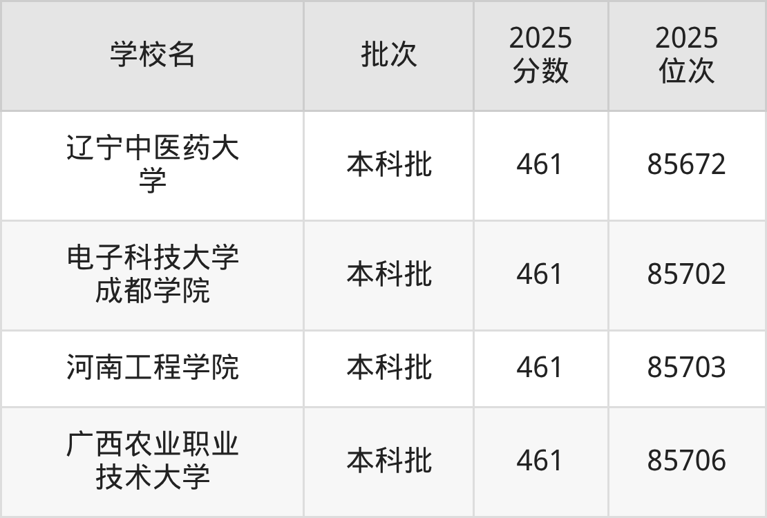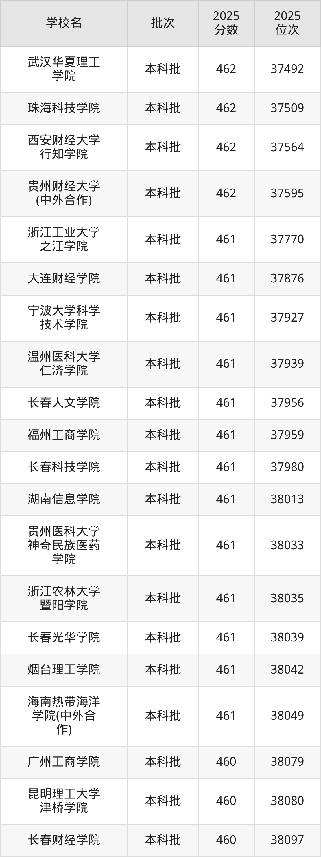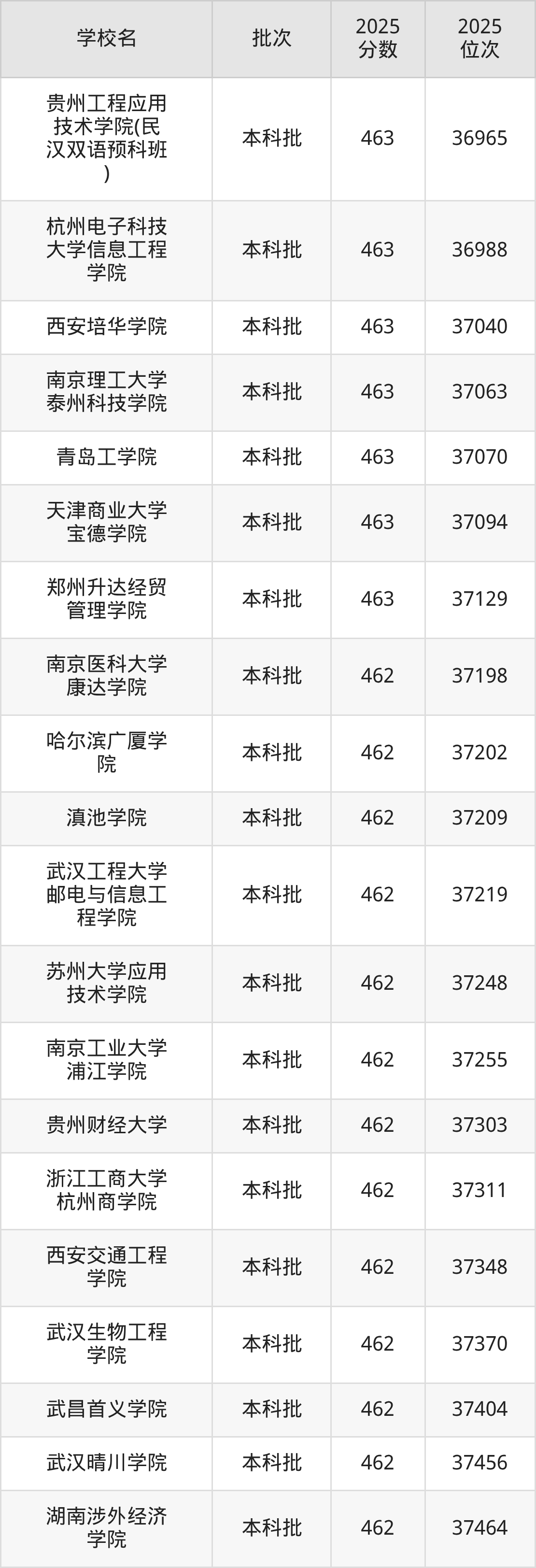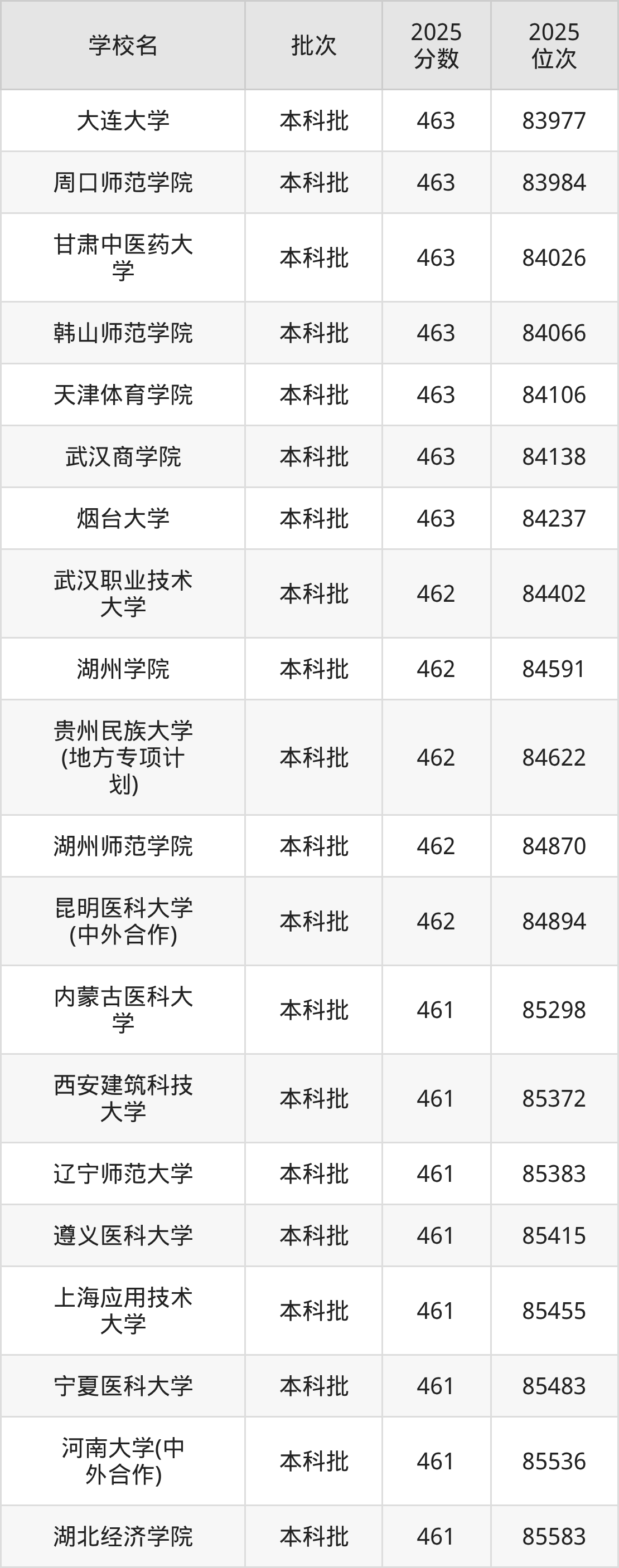 2025年贵州高考物理类462分(84274名~85209名)能上的大学有贵州民族大学(地方专项计划)、湖州学院、武汉职业技术大学、昆明医科大学(中外合作)等。