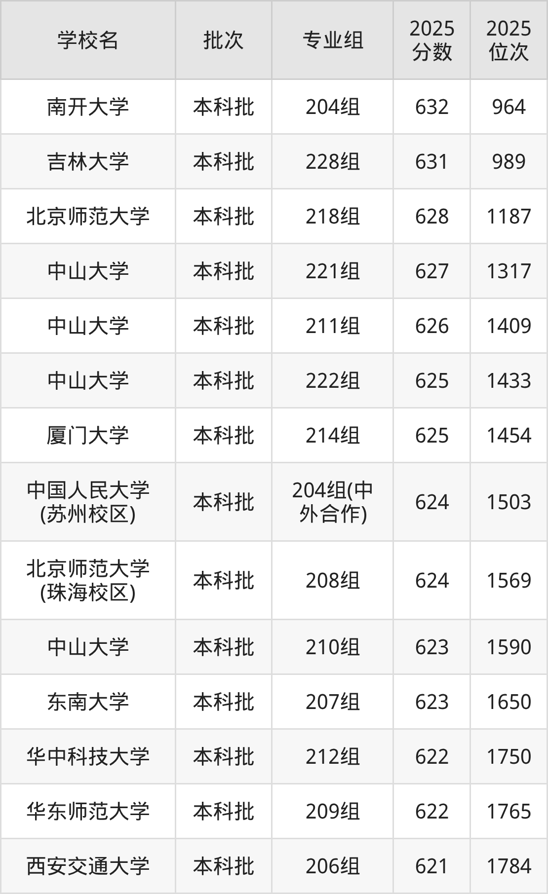 2025年广东高考历史类627分(1258名~1338名)能上的大学有中山大学221组。