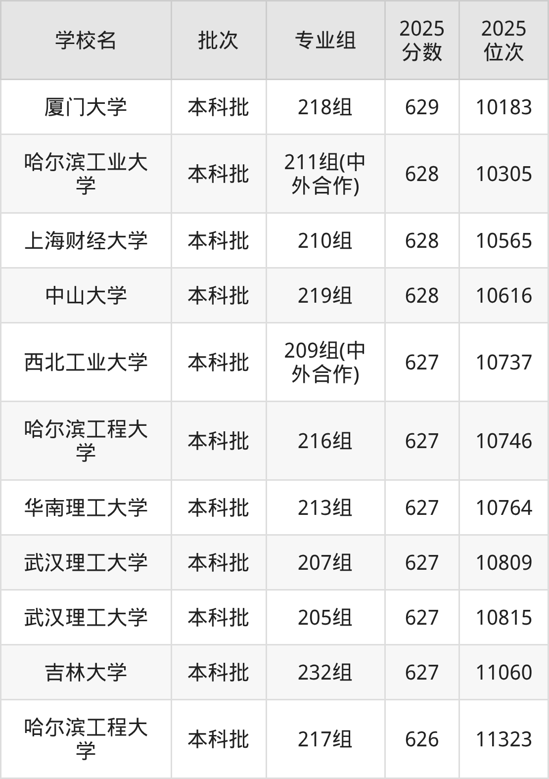 2025年广东高考物理类627分(10671名~11061名)能上的大学有吉林大学232组、哈尔滨工程大学216组、武汉理工大学205组、武汉理工大学207组等。