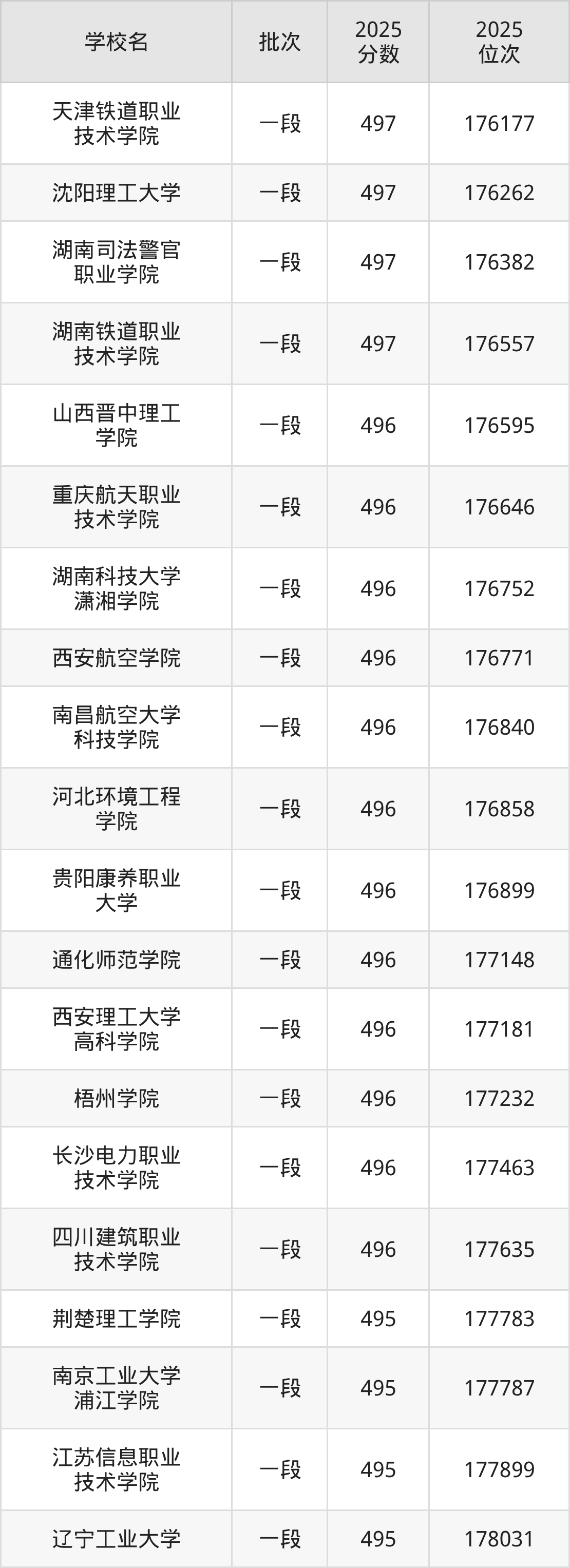 2025年浙江高考496分(176564名~177704名)能上的大学有湖南科技大学潇湘学院、长沙电力职业技术学院、河北环境工程学院、西安理工大学高科学院等。