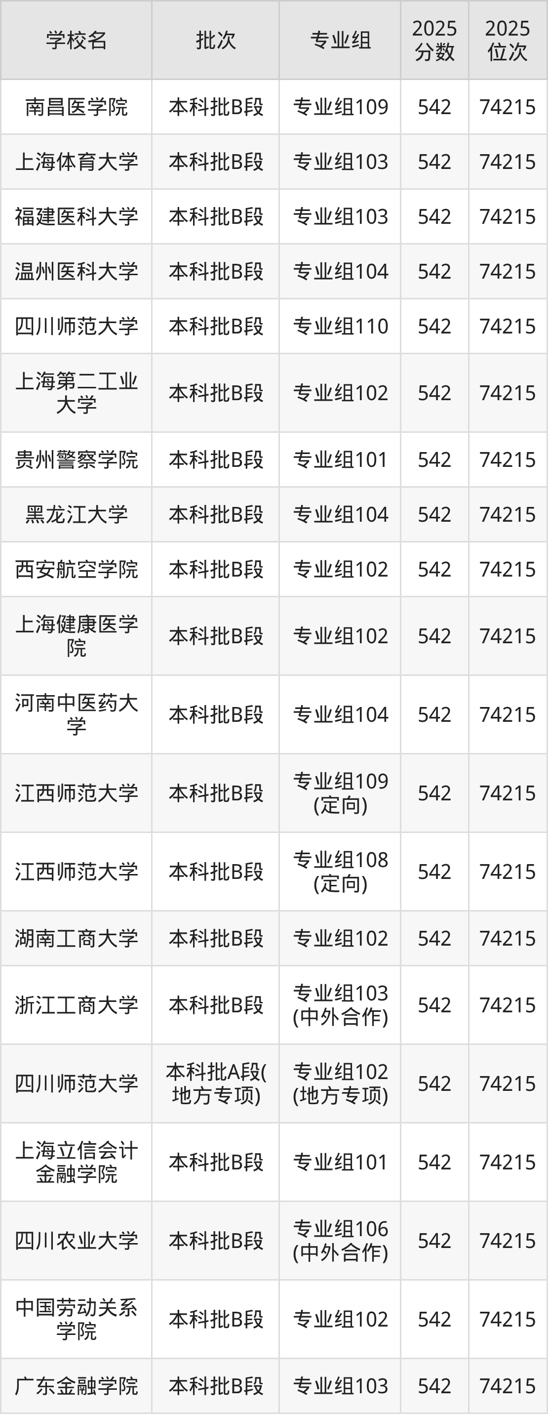 另外录取位次低于该区间(较稳妥)的有上海体育大学专业组101(76490名)、浙江中医药大学专业组103(76490名)等;录取位次高于该区间(可冲)的有四川师范大学专业组110(74215名)、上海第二工业大学专业组102(74215名)等。