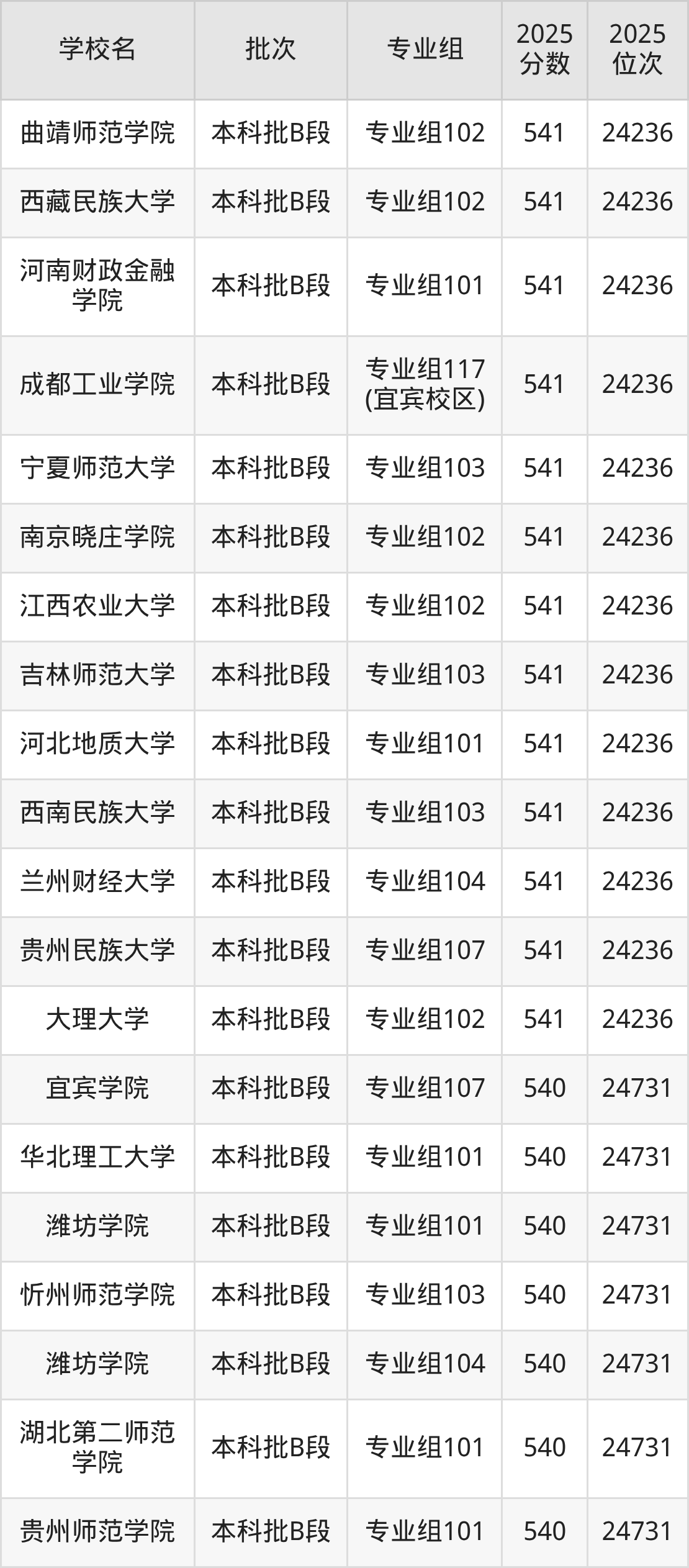 2025年四川高考历史类541分(23751名~24236名)能上的大学有成都工业学院专业组117(宜宾校区)、河北地质大学专业组101、大理大学专业组102、贵州民族大学专业组107等。