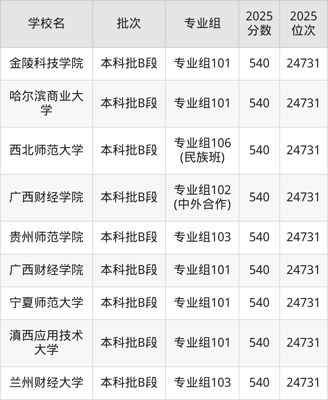 另外录取位次低于该区间(较稳妥)的有西北师范大学专业组106(民族班)(24731名)、华北理工大学专业组101(24731名)等;录取位次高于该区间(可冲)的有青海民族大学专业组103(23750名)、遵义师范学院专业组101(23750名)等。