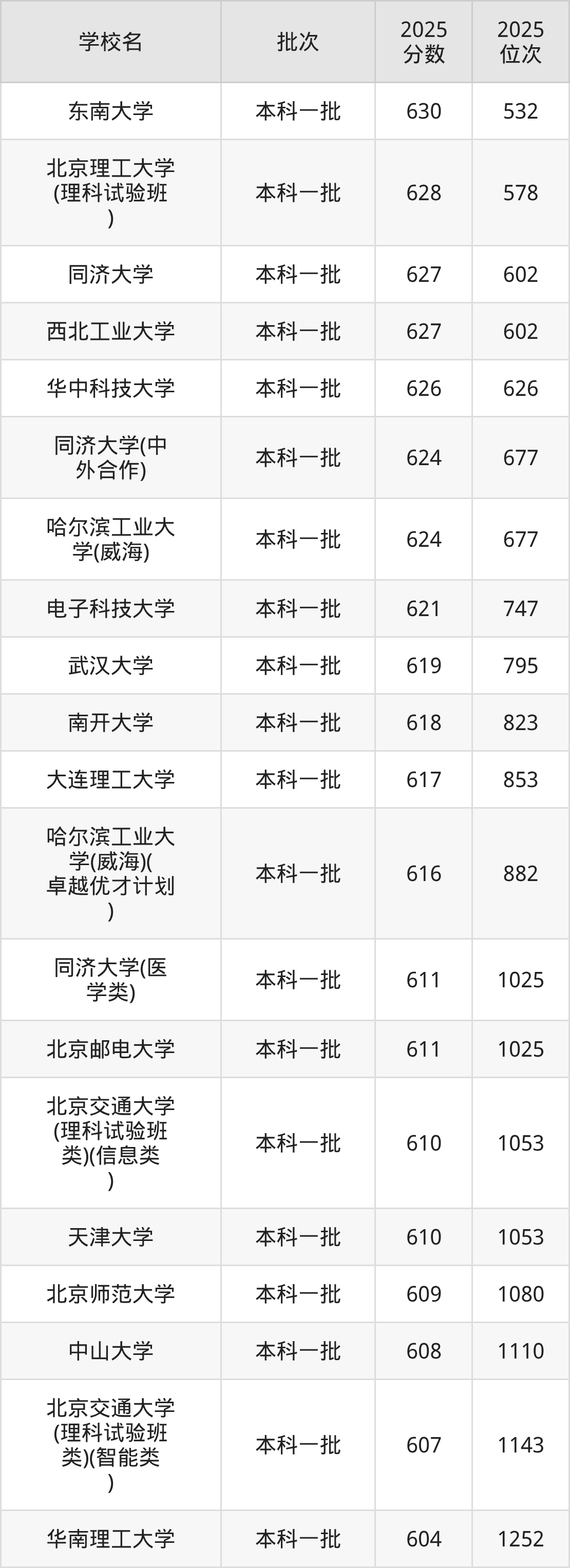 2025年新疆高考理科611分(999名~1025名)能上的大学有北京邮电大学、同济大学(医学类)。