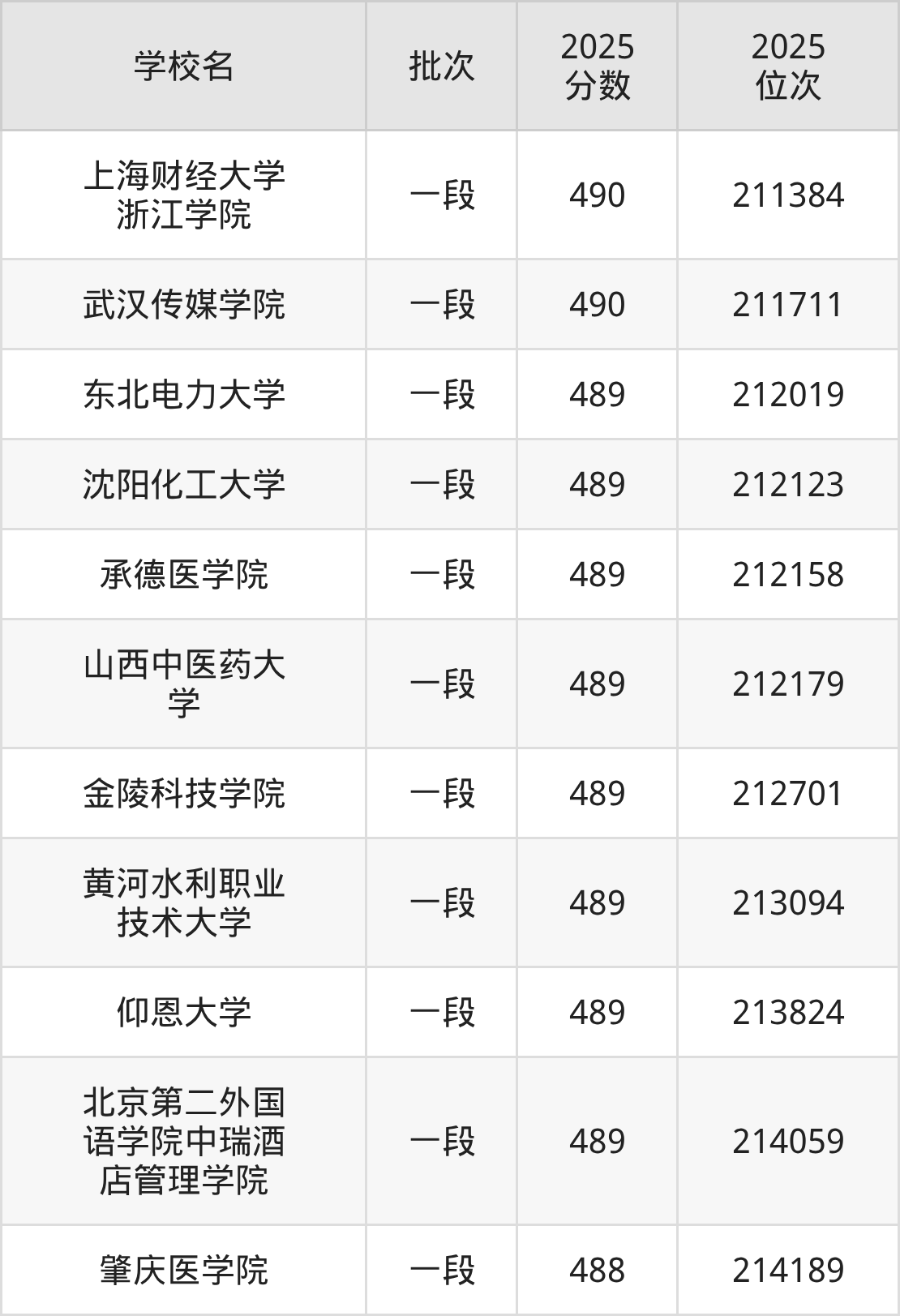 山东高考489分:排名214157位。该分数位次对应能上的大学有北京第二外国语学院中瑞酒店管理学院、金陵科技学院、仰恩大学、黄河水利职业技术大学,更多名单如下文所示,2026届考生可参考。