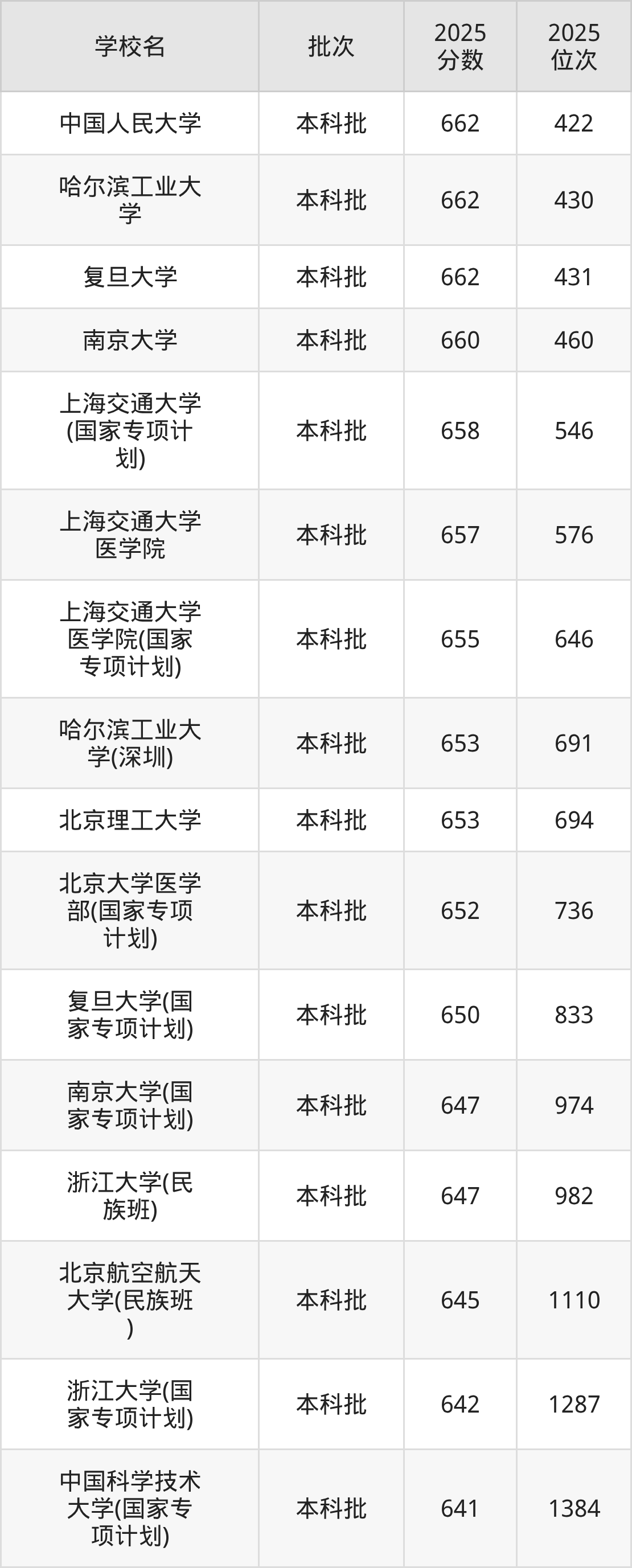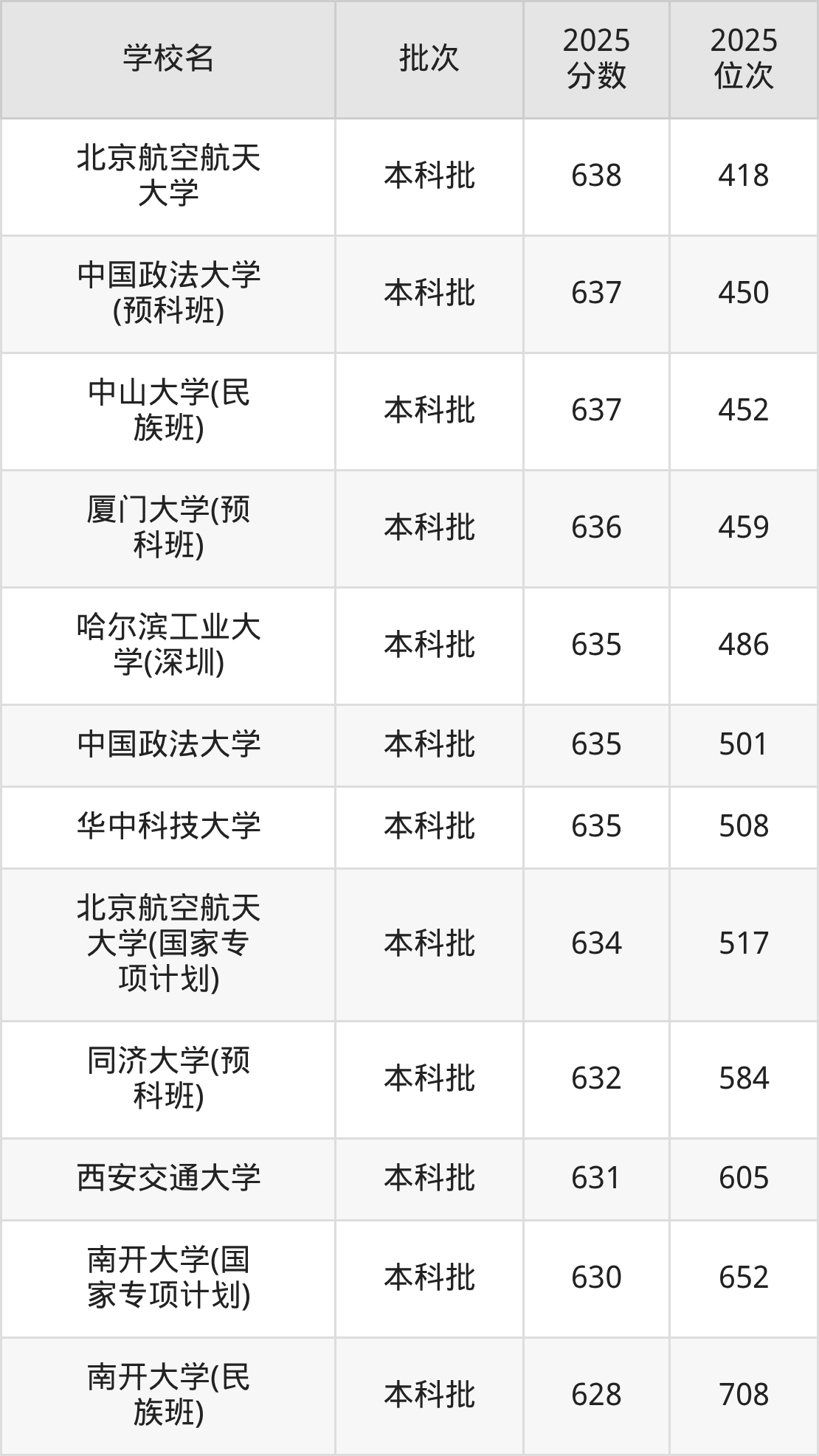 2025年贵州高考物理类648分(901名~965名)录取位次低于该区间(较稳妥)的有南京大学(国家专项计划)(974名)、浙江大学(民族班)(982名)等;录取位次高于该区间(可冲)的有复旦大学(国家专项计划)(833名)、北京大学医学部(国家专项计划)(736名)等。