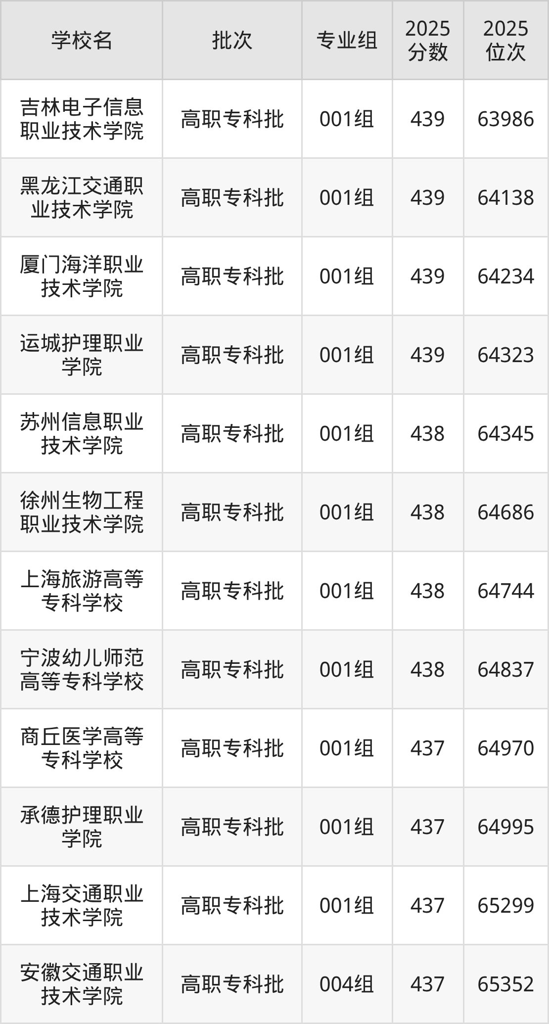 2025年安徽高考历史类438分(64344名~64886名)能上的大学有宁波幼儿师范高等专科学校001组、上海旅游高等专科学校001组、苏州信息职业技术学院001组、徐州生物工程职业技术学院001组。