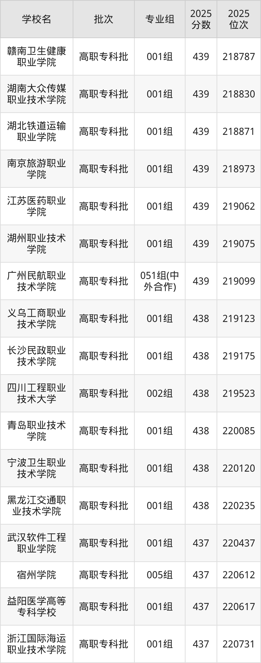 2025年安徽高考物理类438分(219109名~220279名)能上的大学有长沙民政职业技术学院001组、黑龙江交通职业技术学院001组、宁波卫生职业技术学院001组、青岛职业技术学院001组等。