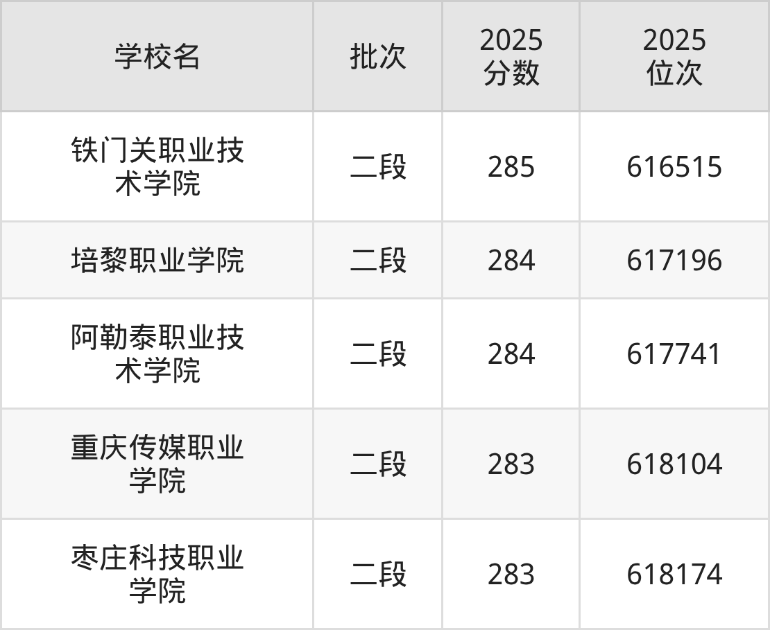 这些都是2026年高考616658名~617839名考生可以报考的大学,更多学校名单如下表所示: