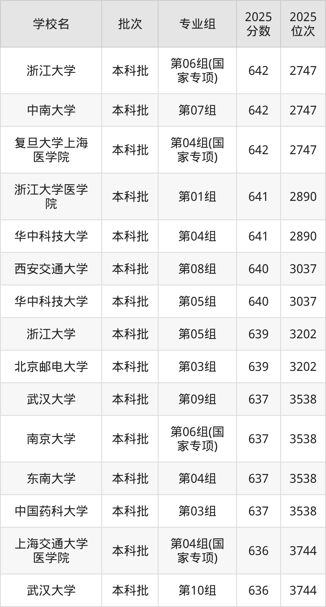 2025年湖北高考物理类638分(3203名~3375名)录取位次低于该区间(较稳妥)的有中国药科大学第03组(3538名)、东南大学第04组(3538名)等;录取位次高于该区间(可冲)的有北京邮电大学第03组(3202名)、浙江大学第05组(3202名)等。