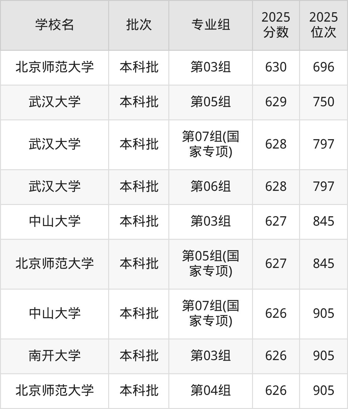 2025年湖北高考历史类638分(390名~416名)录取位次低于该区间(较稳妥)的有中国政法大学第05组(442名)、同济大学第03组(503名)等;录取位次高于该区间(可冲)的有南京大学第03组(国家专项)(338名)、南京大学第02组(223名)等。