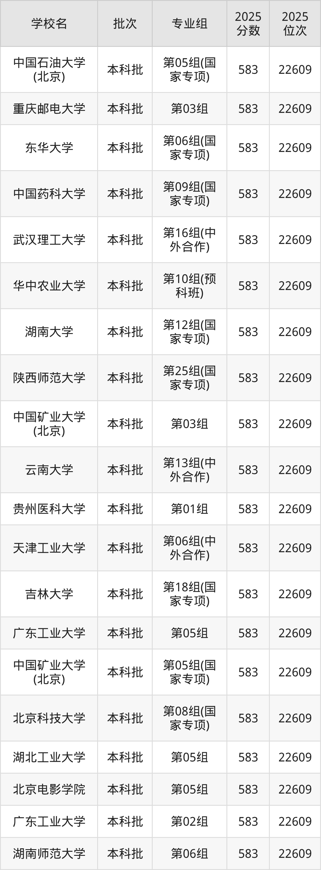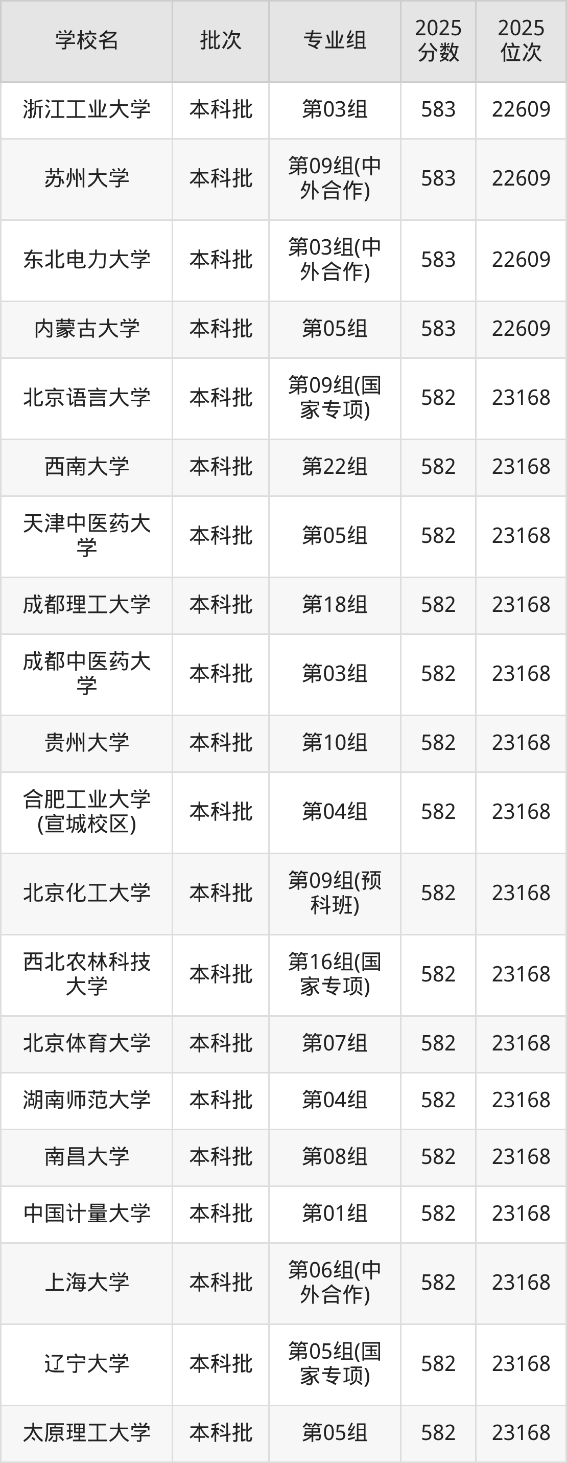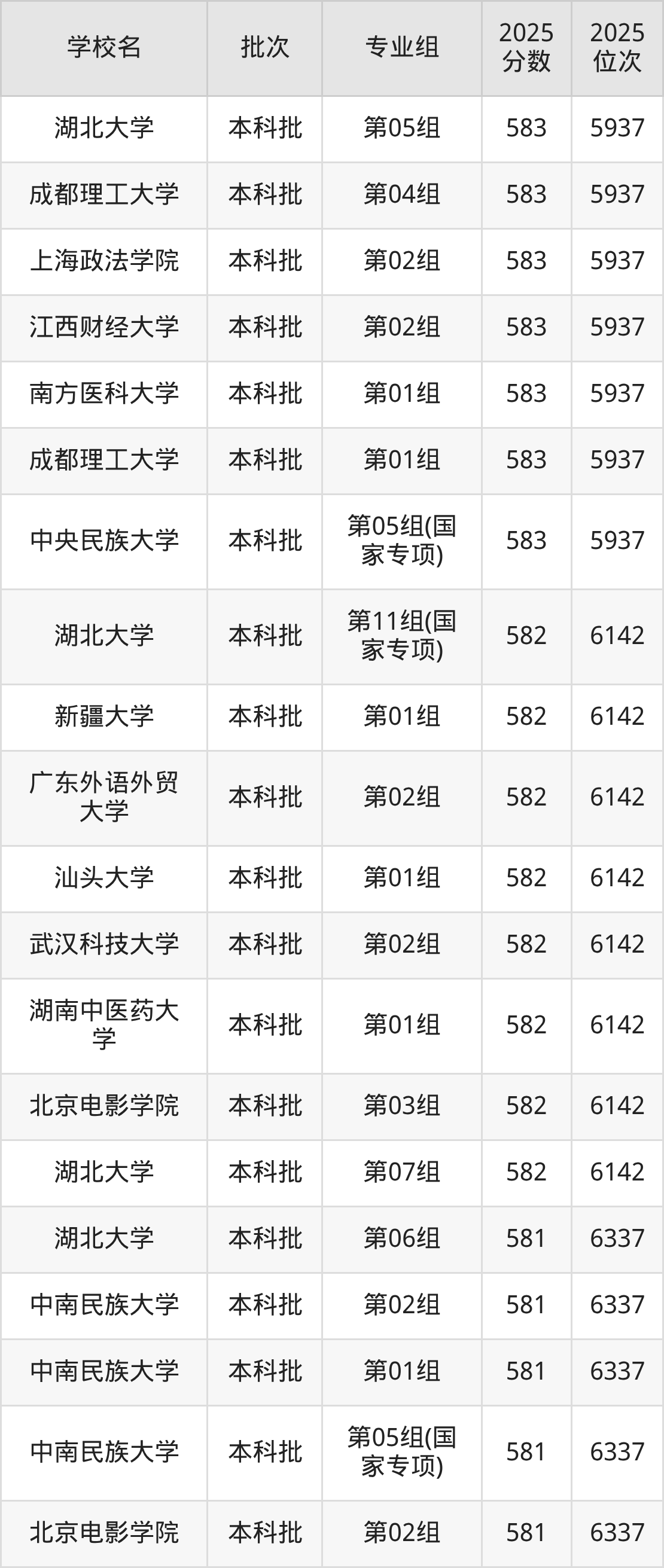 2025年湖北高考历史类582分(5938名~6142名)能上的大学有武汉科技大学第02组、湖北大学第07组、湖北大学第11组(国家专项)、北京电影学院第03组等。