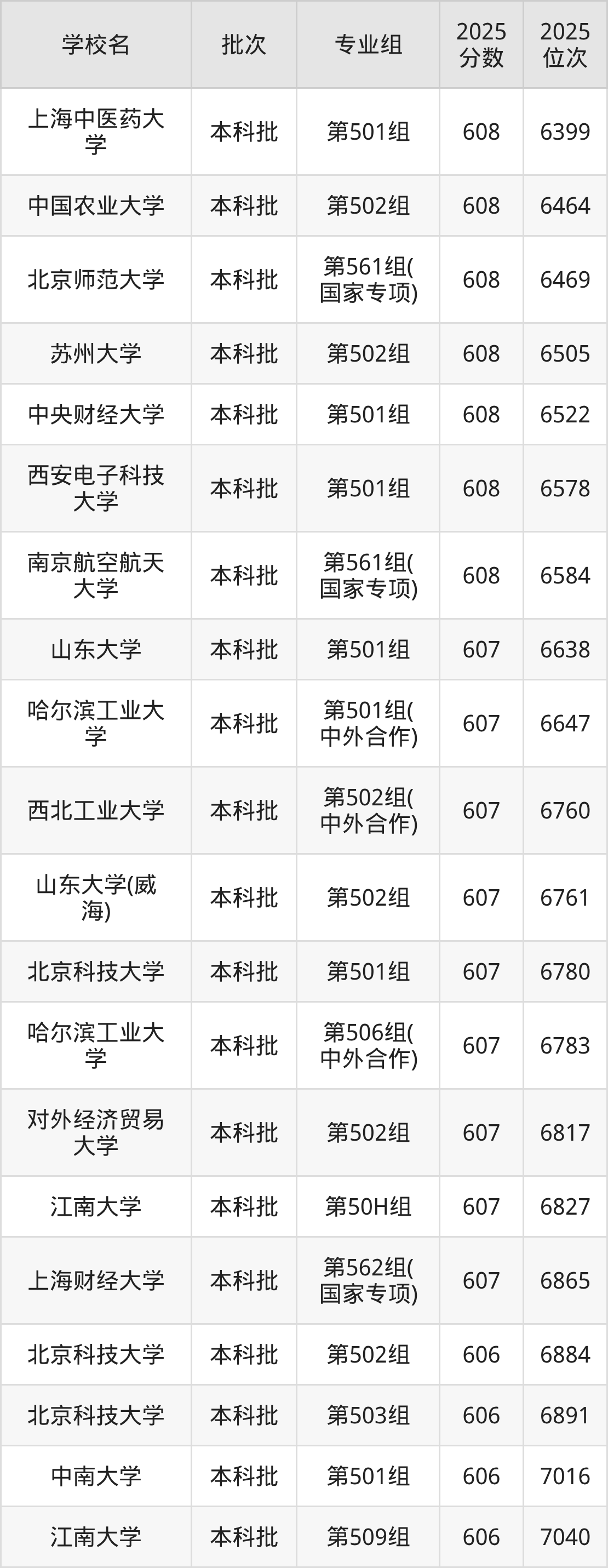 另外录取位次低于该区间(较稳妥)的有北京邮电大学第503组(中外合作)(7355名)、江南大学第50G组(7372名)等;录取位次高于该区间(可冲)的有上海财经大学第562组(国家专项)(6865名)、江南大学第50H组(6827名)等。