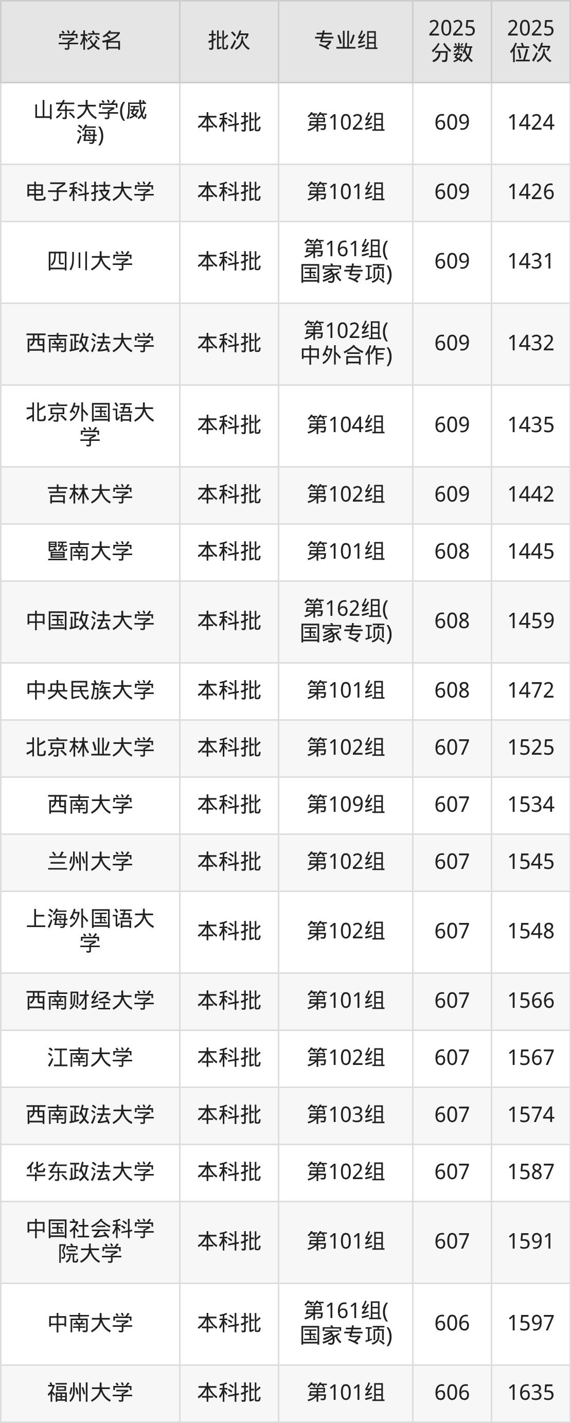 另外录取位次低于该区间(较稳妥)的有中国社会科学院大学第102组(1674名)、中国海洋大学第101组(1682名)等;录取位次高于该区间(可冲)的有中国社会科学院大学第101组(1591名)、华东政法大学第102组(1587名)等。