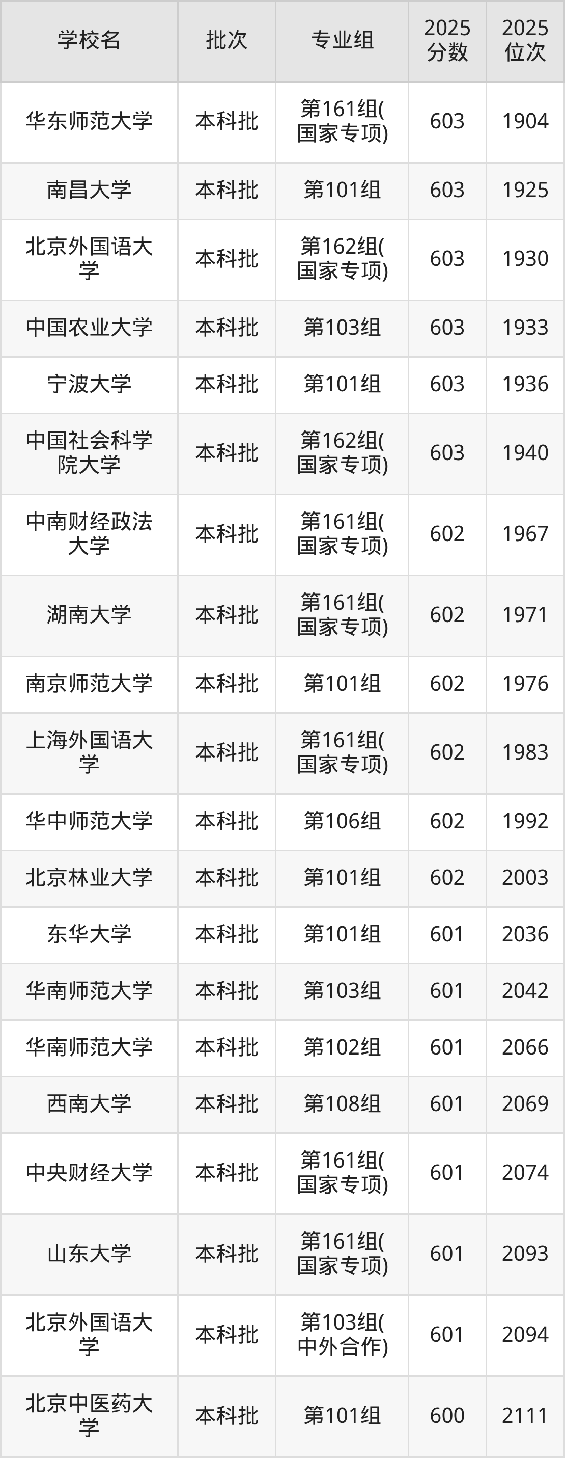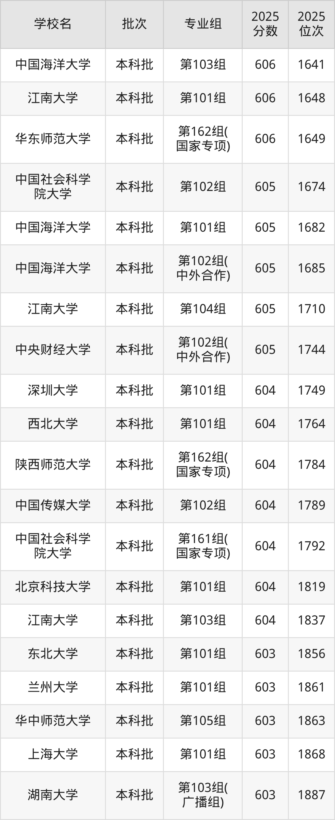 2025年江西高考历史类606分(1594名~1659名)能上的大学有华东师范大学第162组(国家专项)、江南大学第101组、福州大学第101组、中国海洋大学第103组等。