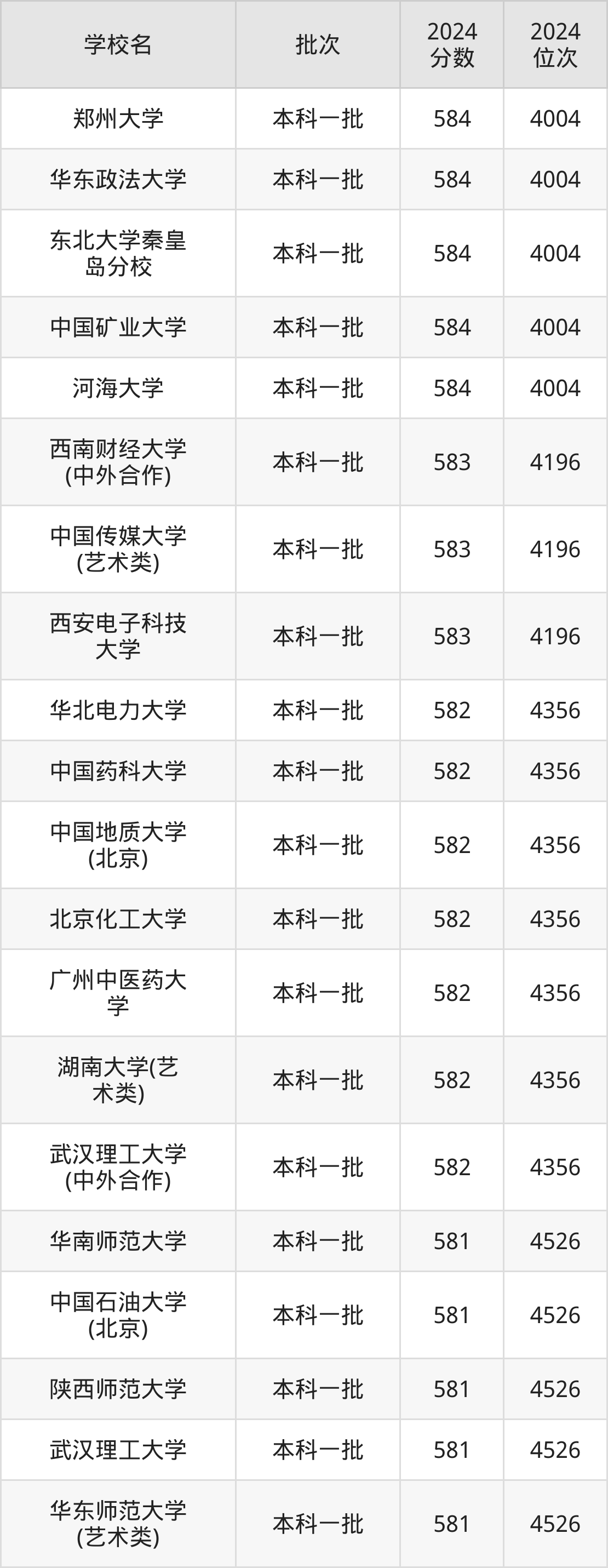 2024年河南高考文科581分(4357名~4526名)能上的大学有武汉理工大学、华南师范大学、陕西师范大学、中国石油大学(北京)等。