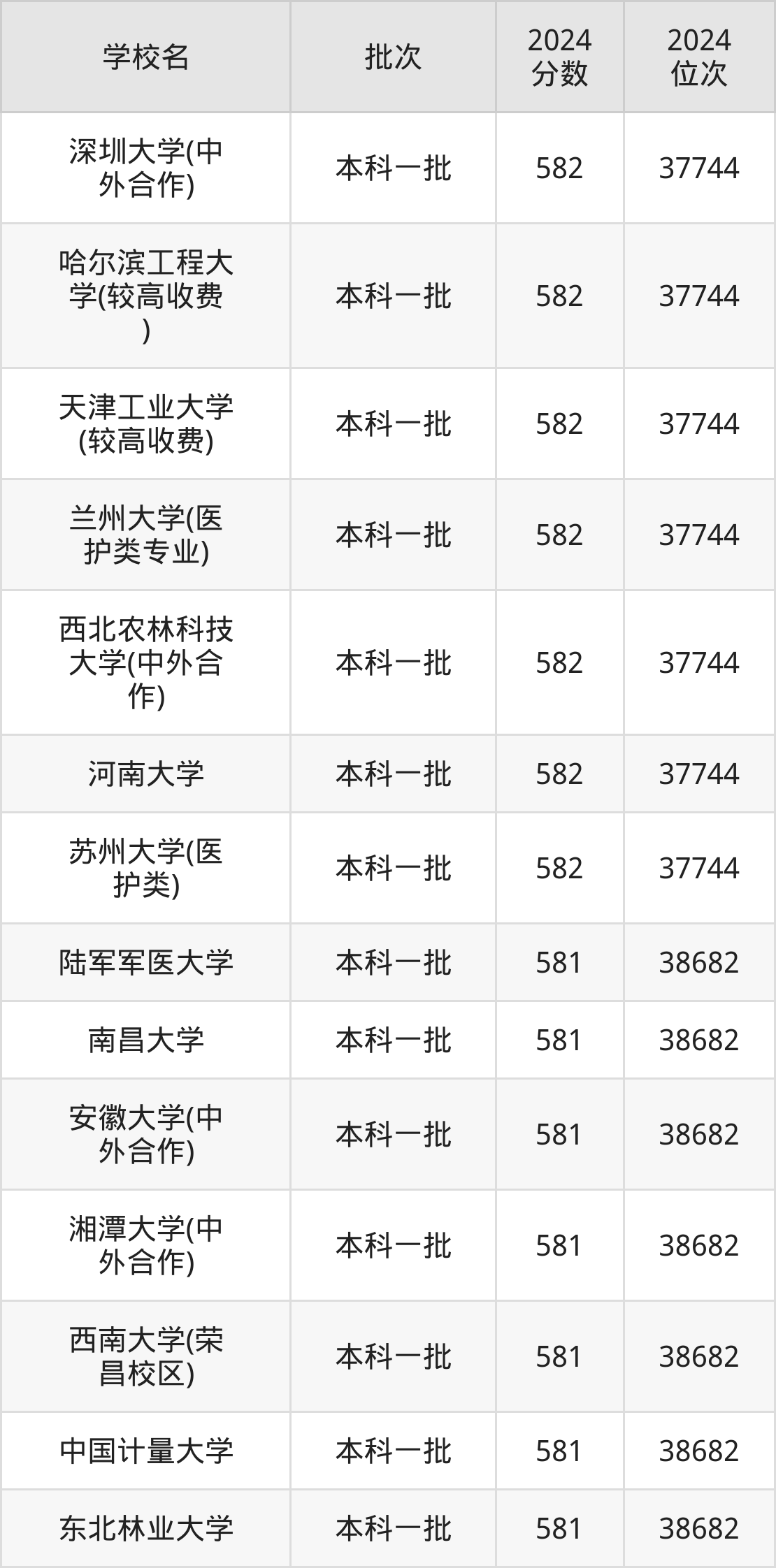 2024年河南高考理科581分(37745名~38682名)能上的大学有南昌大学、东北林业大学、中国计量大学、陆军军医大学等。