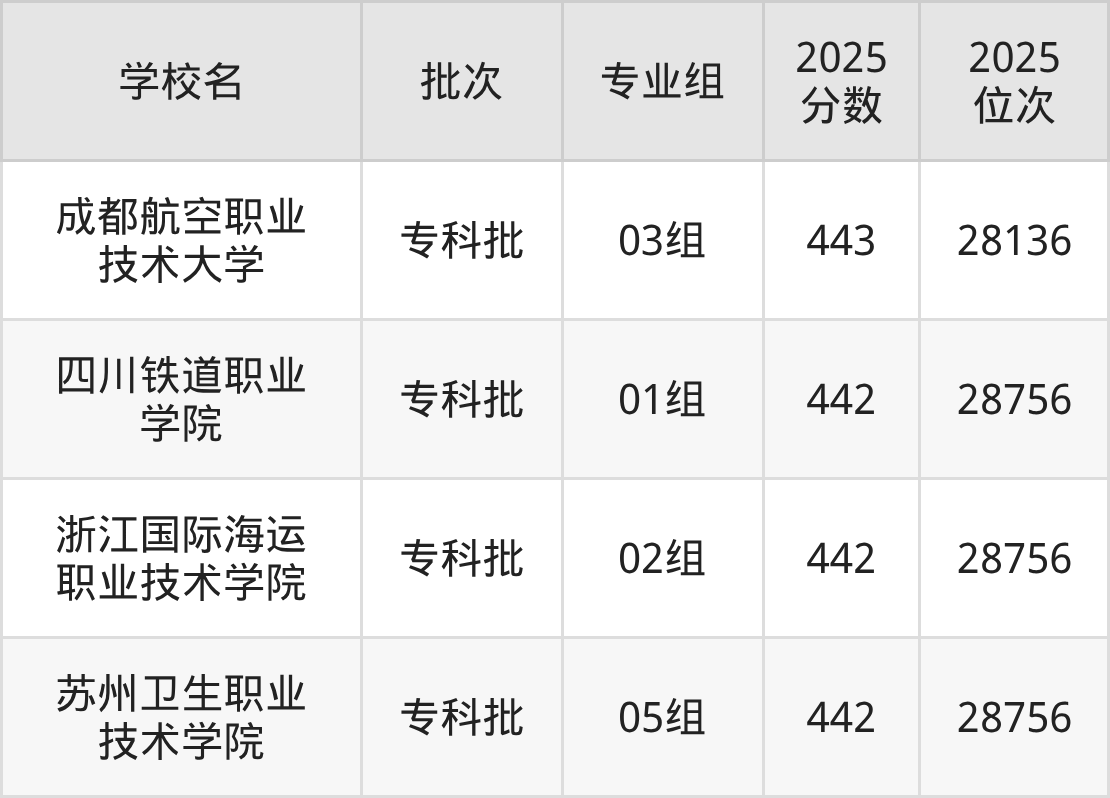 2025年江苏高考物理类442分(28137名~28756名)能上的大学有苏州卫生职业技术学院05组、浙江国际海运职业技术学院02组、四川铁道职业学院01组。