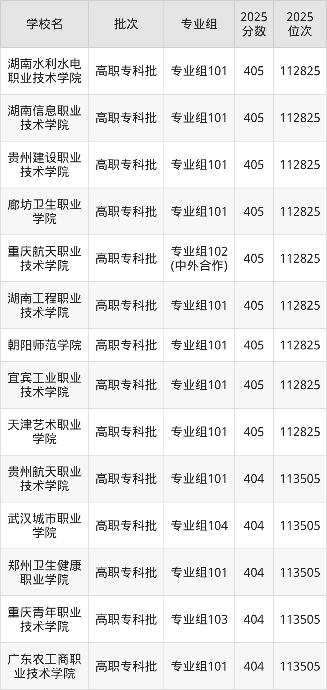 2025年四川高考历史类404分(112826名~113505名)能上的大学有郑州卫生健康职业学院专业组101、贵州航天职业技术学院专业组101、重庆青年职业技术学院专业组103、广东农工商职业技术学院专业组101等。