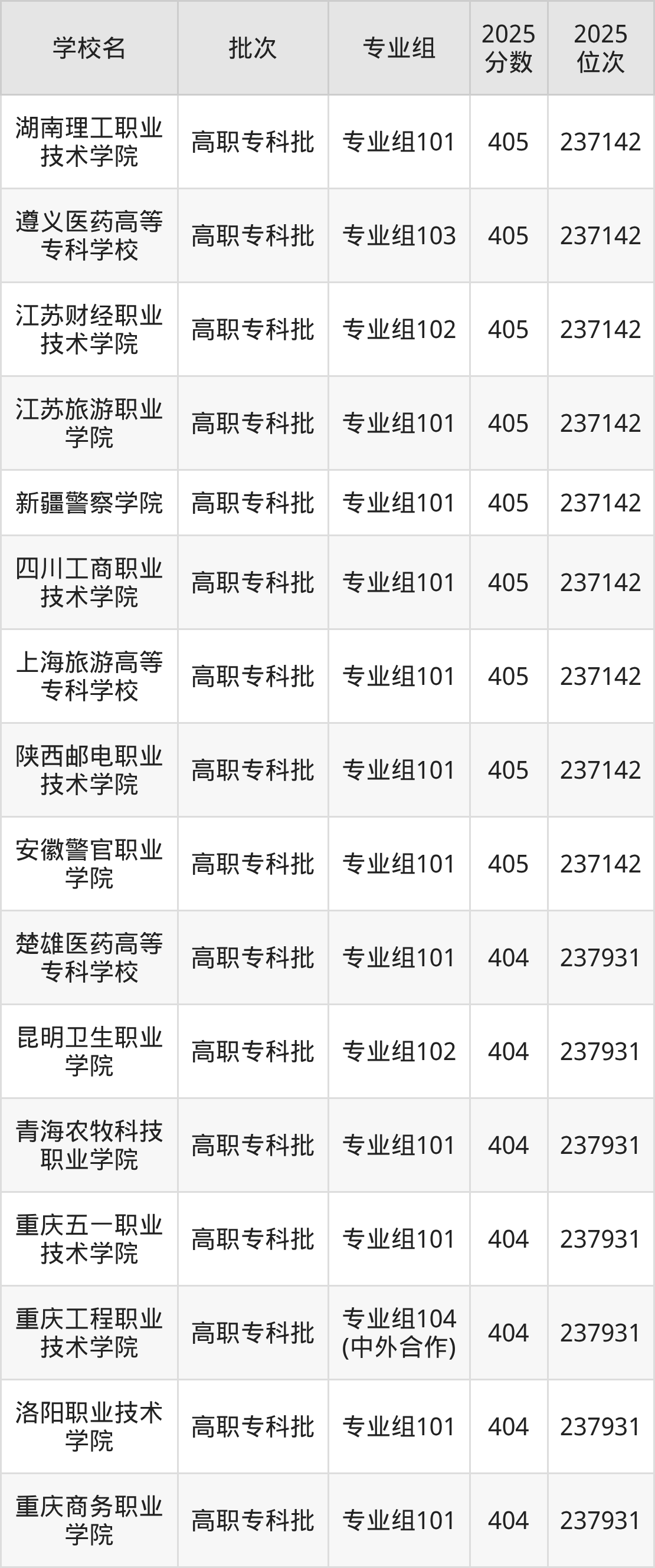 2025年四川高考物理类404分(237143名~237931名)能上的大学有昆明卫生职业学院专业组102、重庆商务职业学院专业组101、洛阳职业技术学院专业组101、楚雄医药高等专科学校专业组101等。