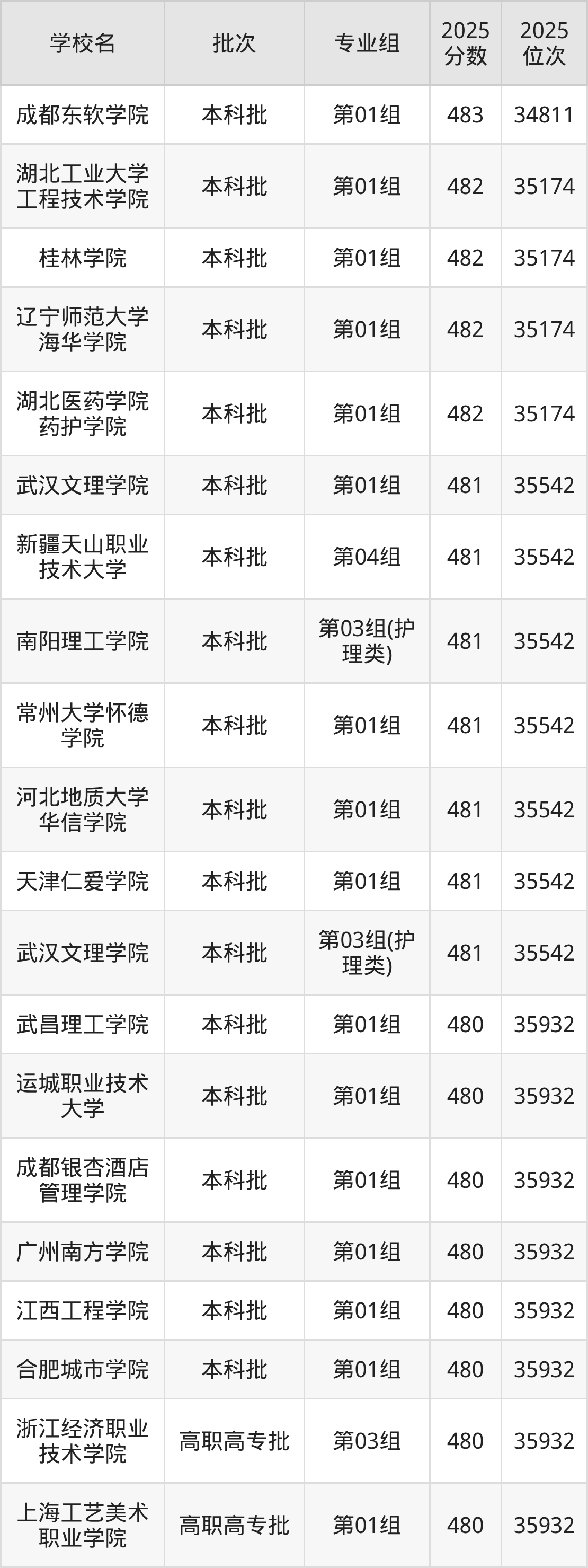 2025年湖北高考历史类481分(35175名~35542名)能上的大学有武汉文理学院第01组、武汉文理学院第03组(护理类)、天津仁爱学院第01组、河北地质大学华信学院第01组等。