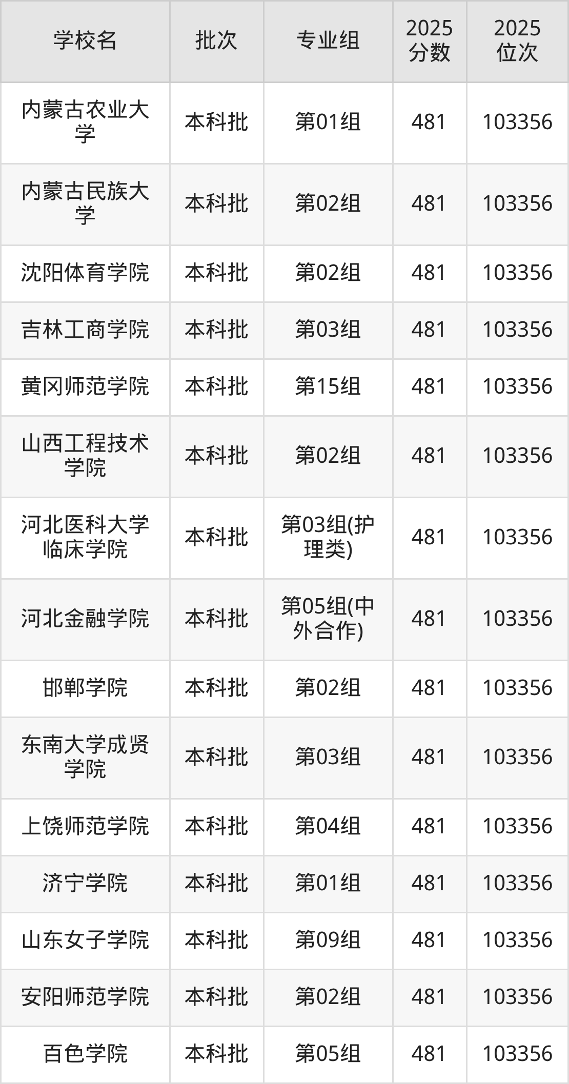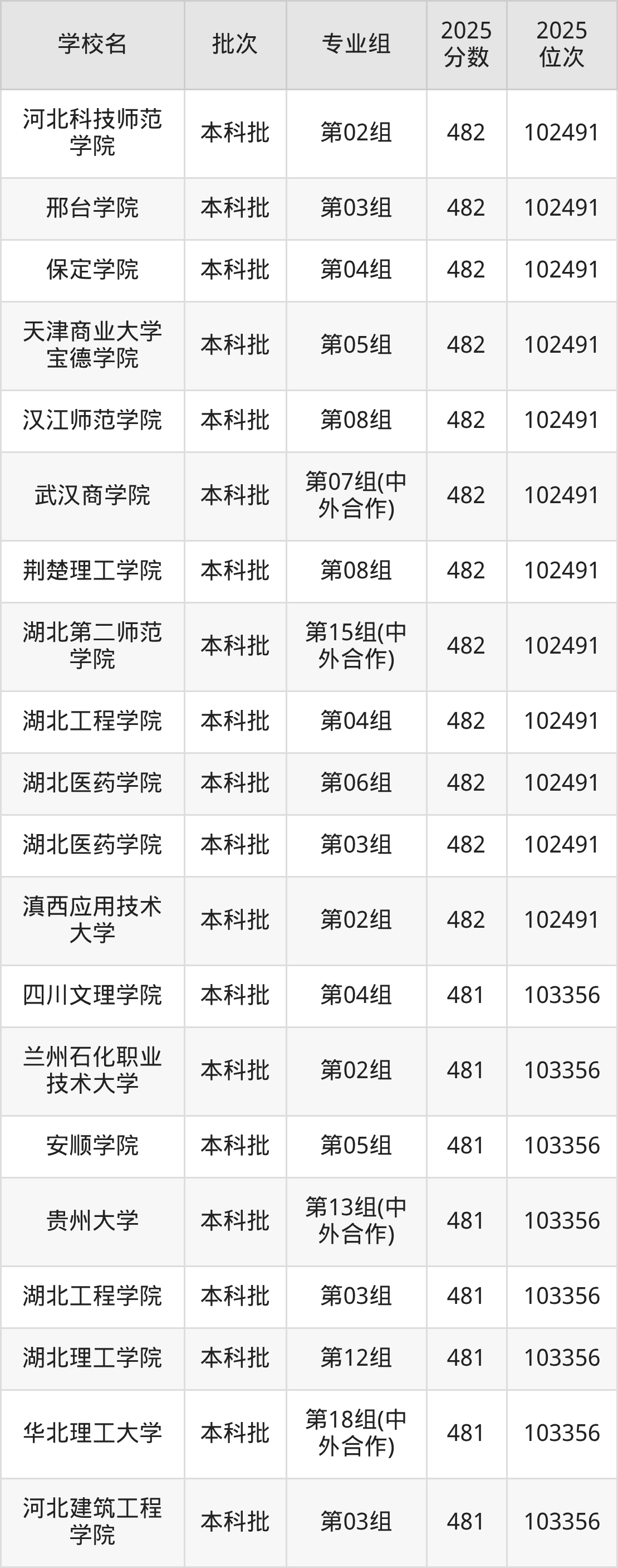 2025年湖北高考物理类481分(102492名~103356名)能上的大学有黄冈师范学院第15组、湖北工程学院第03组、湖北理工学院第12组、华北理工大学第18组(中外合作)等。