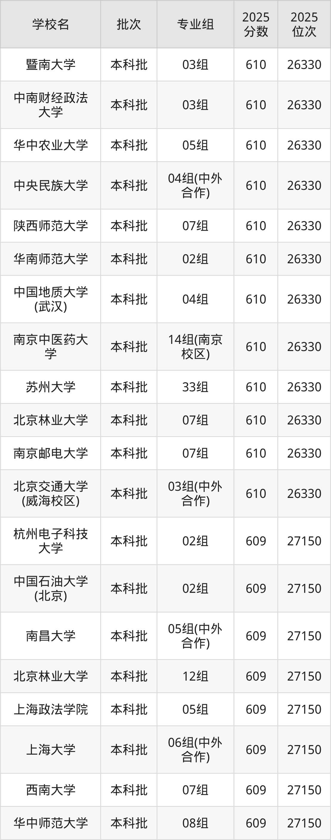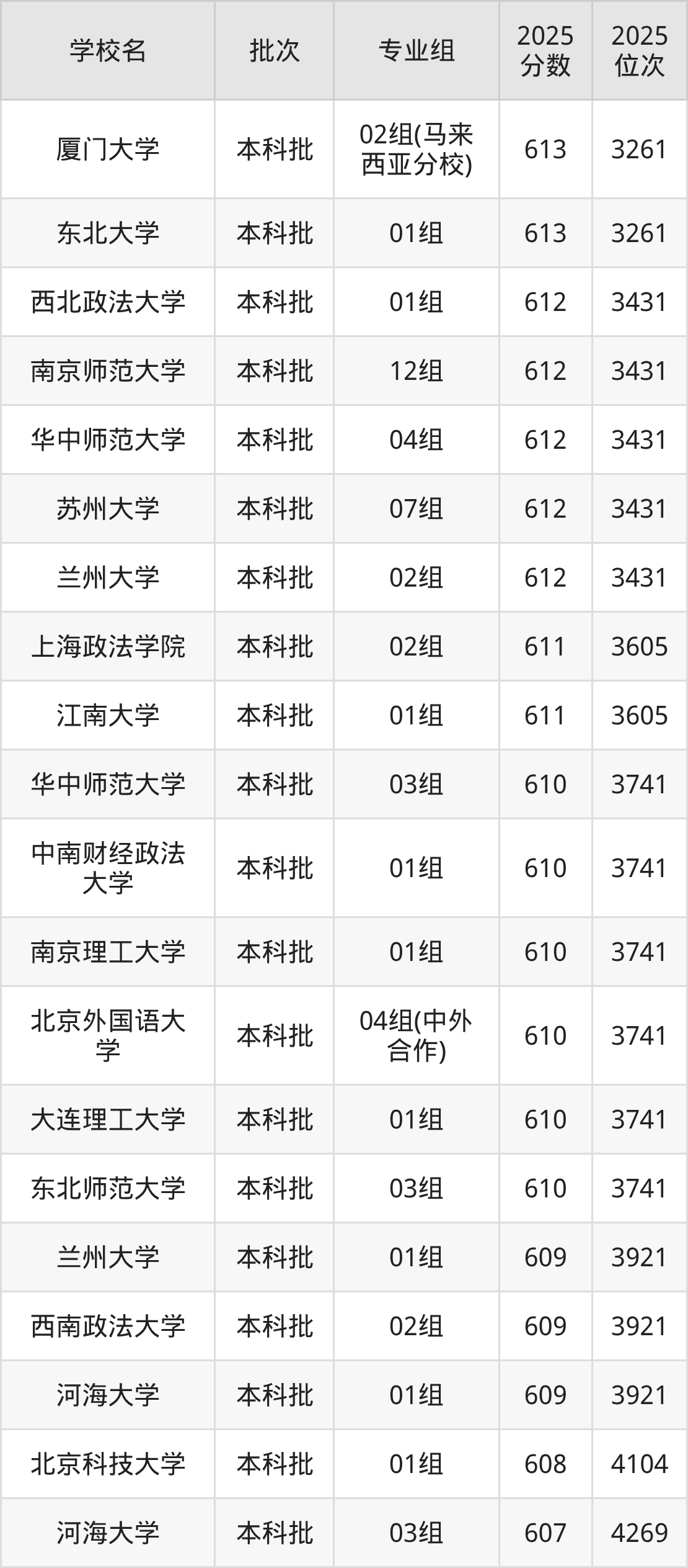 2025年江苏高考历史类609分(3742名~3921名)能上的大学有河海大学01组、西南政法大学02组、兰州大学01组。