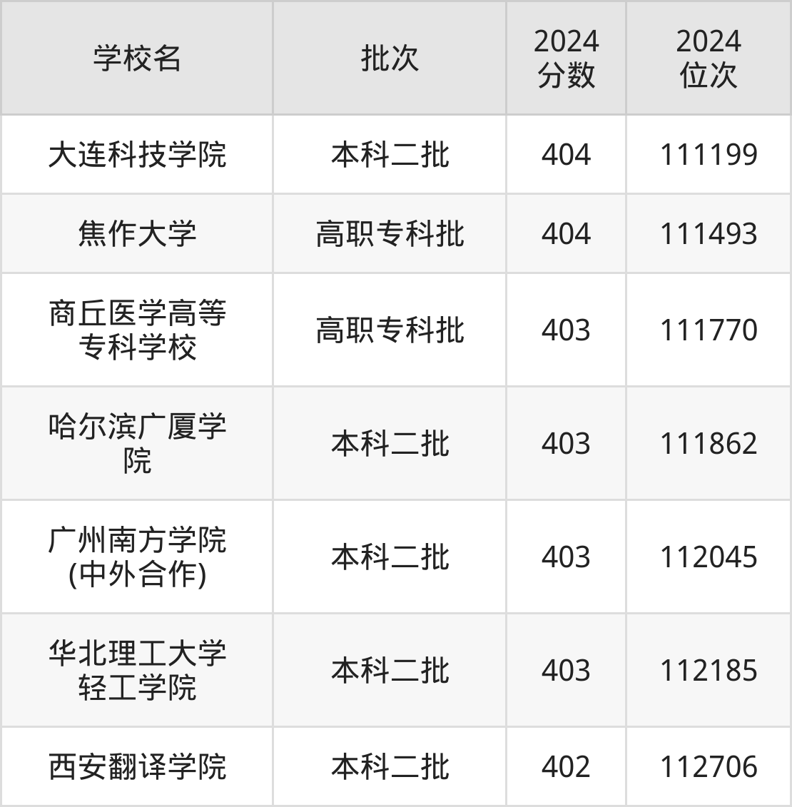 2024年陕西高考理科403分(111638名~112266名)能上的大学有华北理工大学轻工学院、哈尔滨广厦学院、商丘医学高等专科学校、广州南方学院(中外合作)。