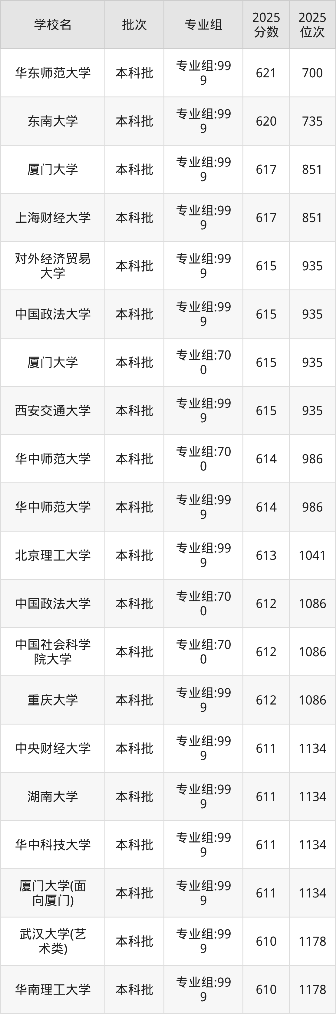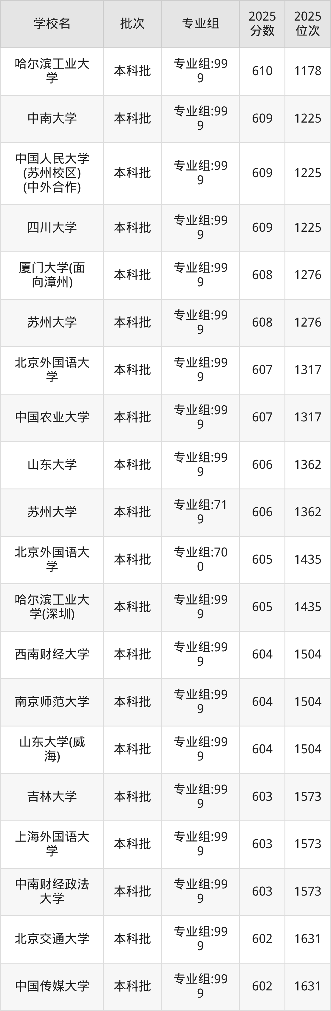 2025年福建高考历史类610分(1135名~1178名)能上的大学有哈尔滨工业大学专业组:999、华南理工大学专业组:999、武汉大学(艺术类)专业组:999。