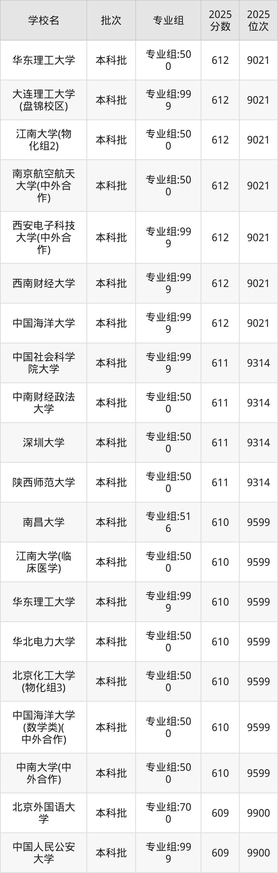 2025年福建高考物理类610分(9315名~9599名)能上的大学有北京化工大学(物化组3)专业组:500、华北电力大学专业组:500、华东理工大学专业组:999、江南大学(临床医学)专业组:500等。