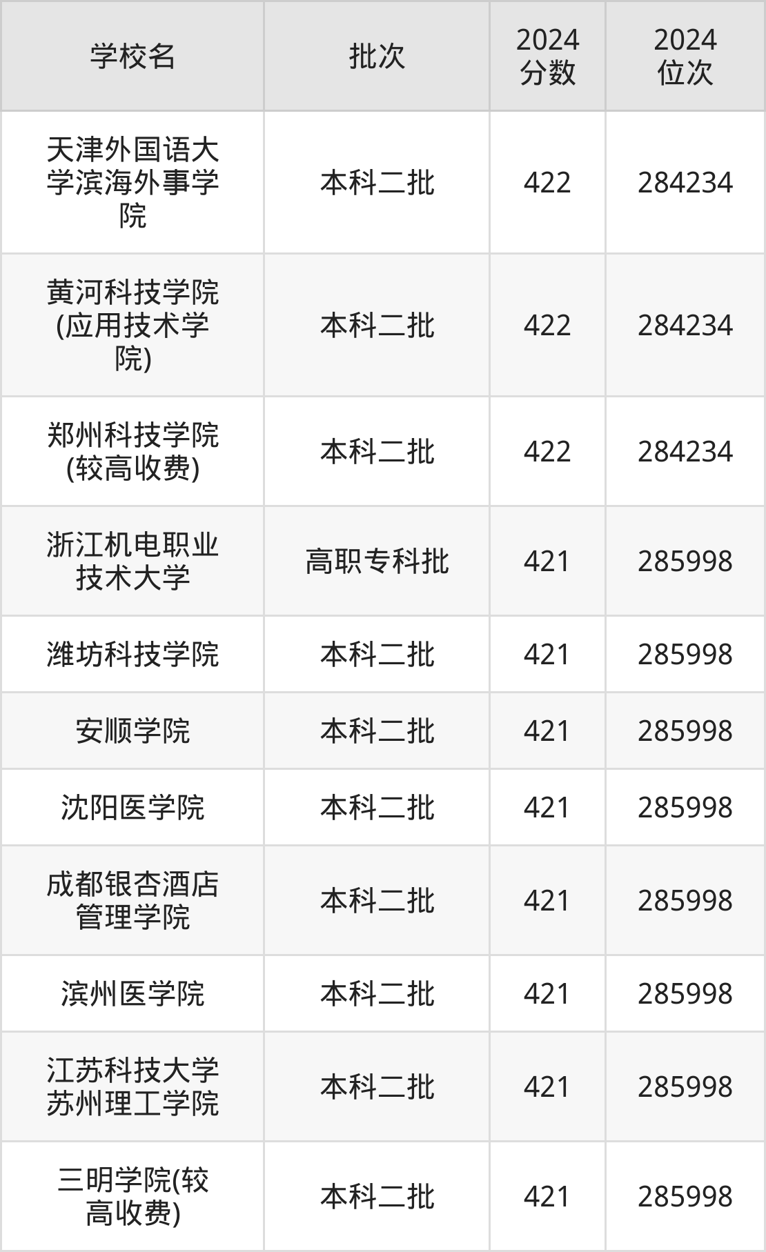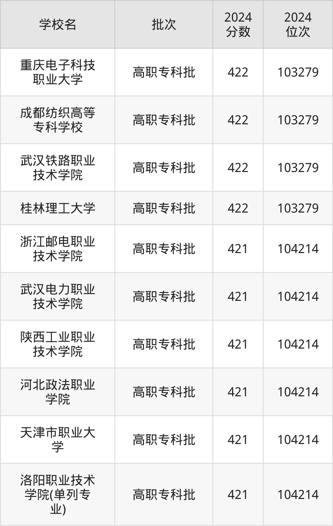 2024年河南高考文科421分(103280名~104214名)能上的大学有天津市职业大学、河北政法职业学院、陕西工业职业技术学院、浙江邮电职业技术学院等。