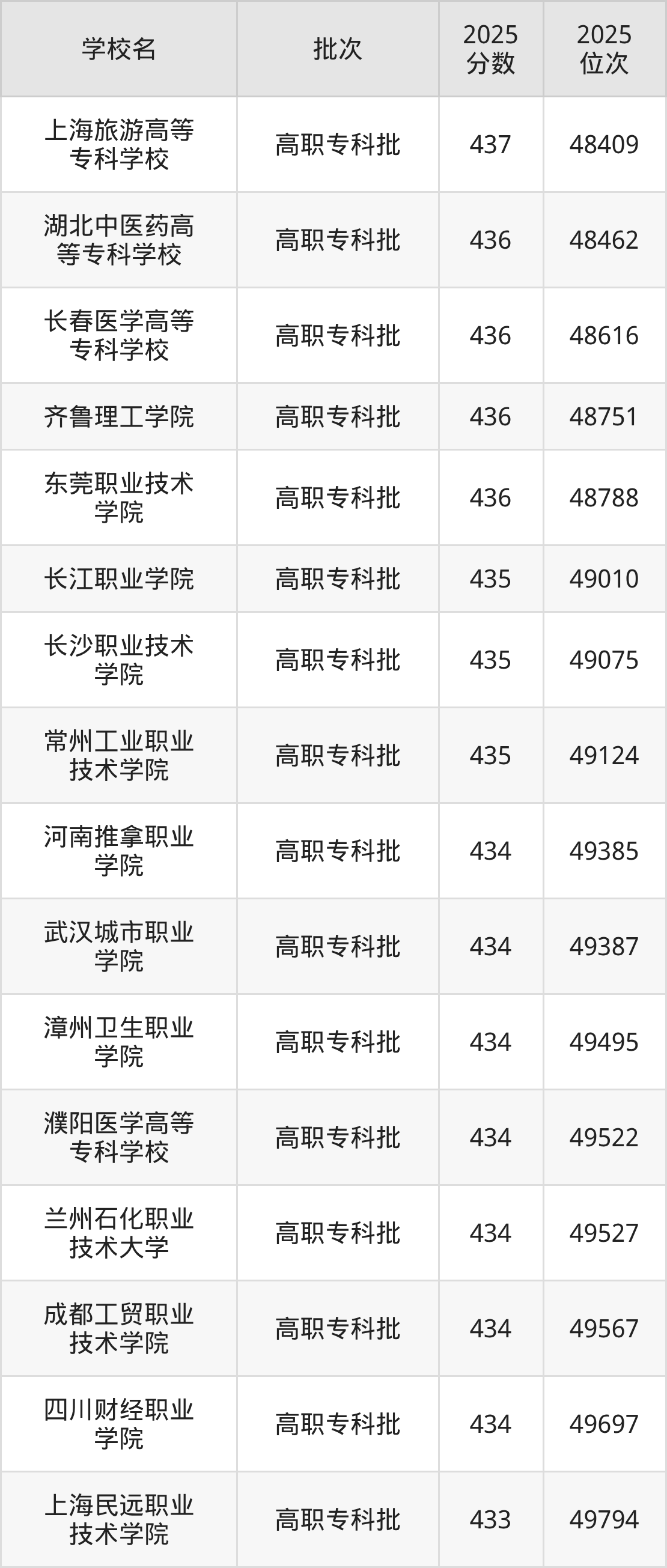 2025年贵州高考历史类435分(48862名~49297名)能上的大学有长江职业学院、长沙职业技术学院、常州工业职业技术学院。