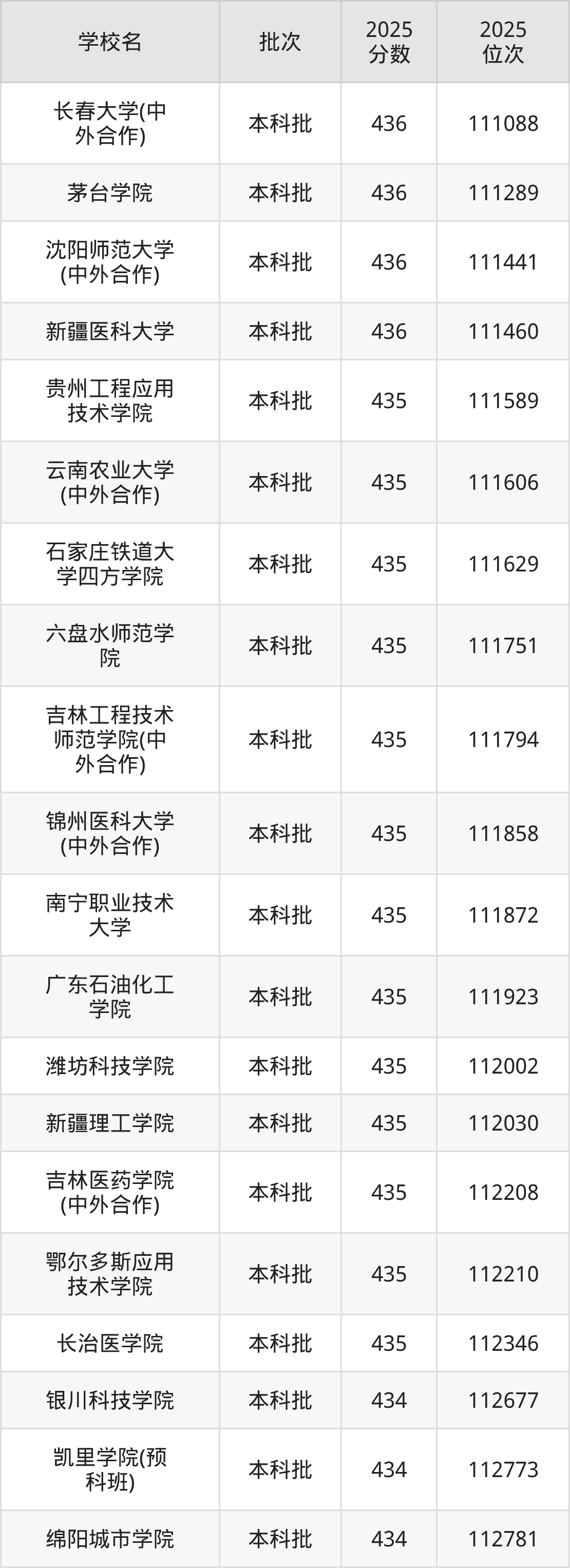 2025年贵州高考物理类435分(111575名~112602名)能上的大学有吉林医药学院(中外合作)、潍坊科技学院、新疆理工学院、锦州医科大学(中外合作)等。